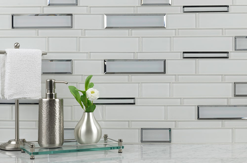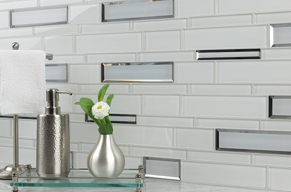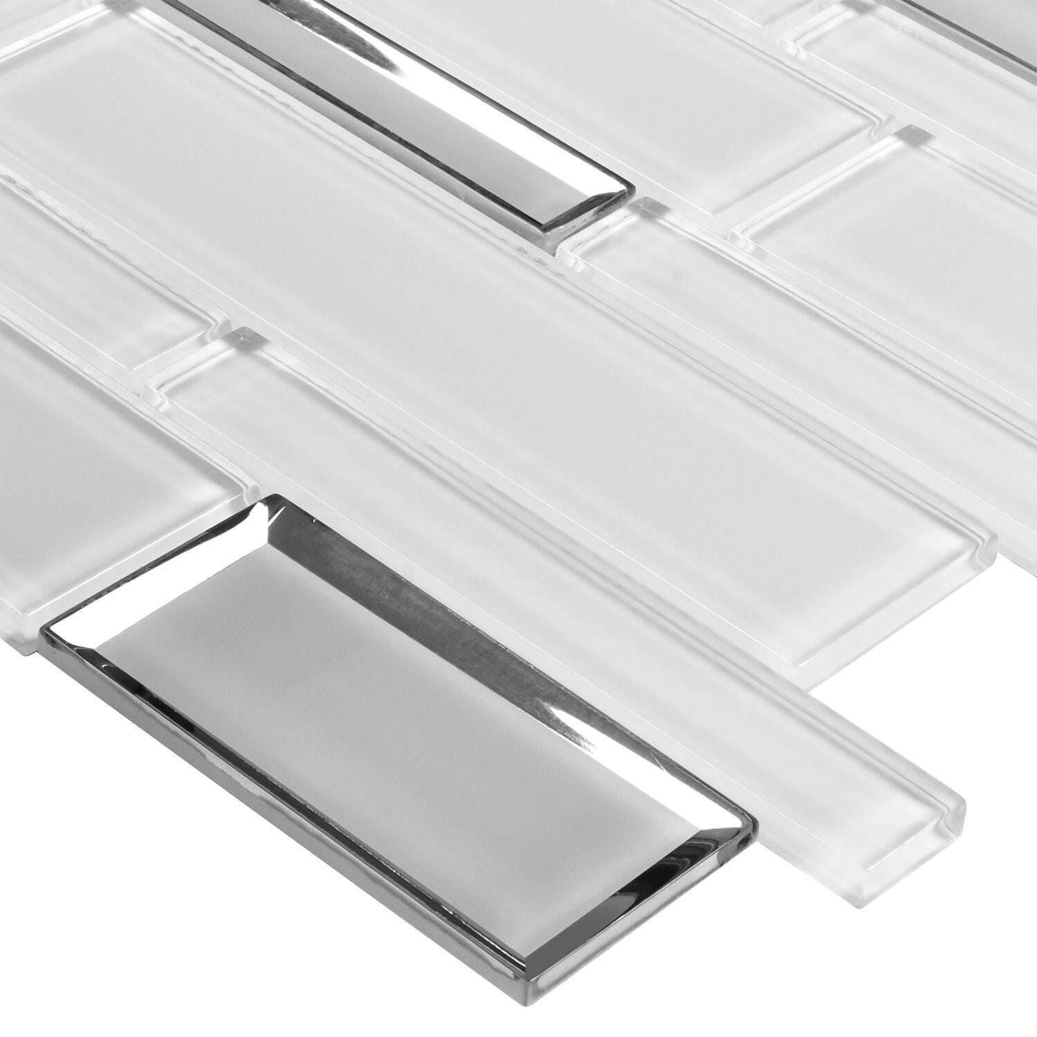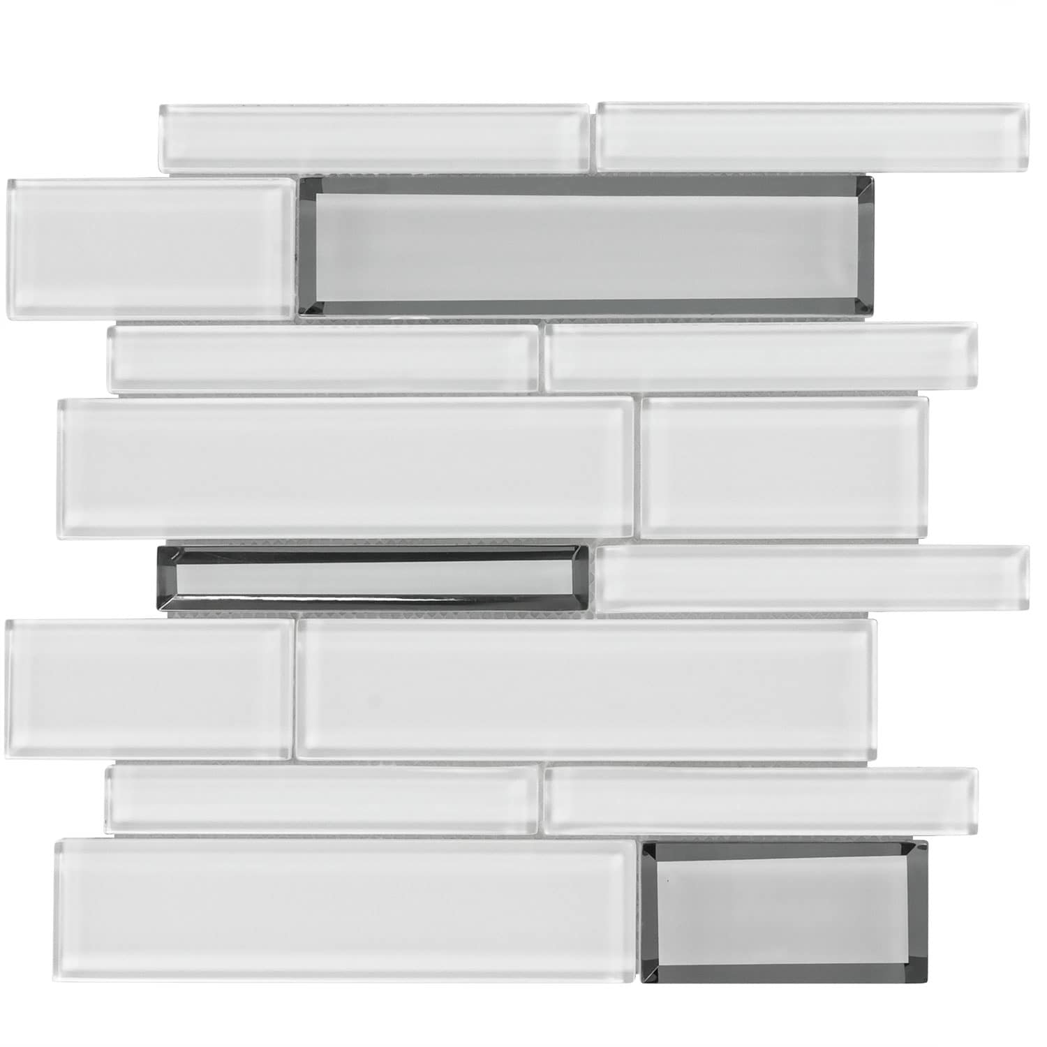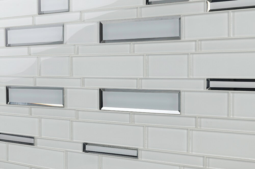 A glossy glass mosaic sheet featuring mirrored linear accents that brighten and modernize backsplashes and feature walls. Each 12 x 12 inch sheet covers 0.96 sq ft and is designed for easy thinset installation on indoor or covered outdoor walls.