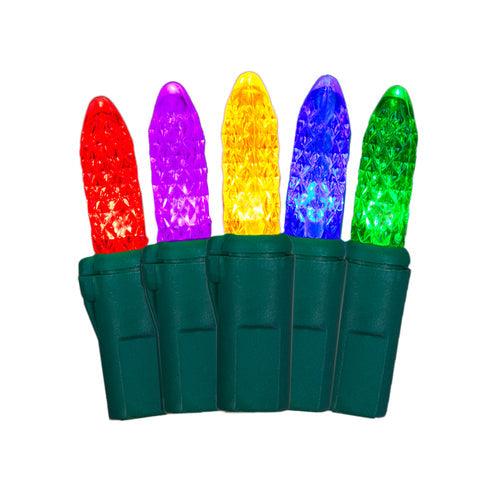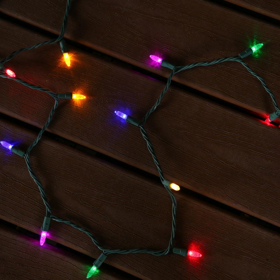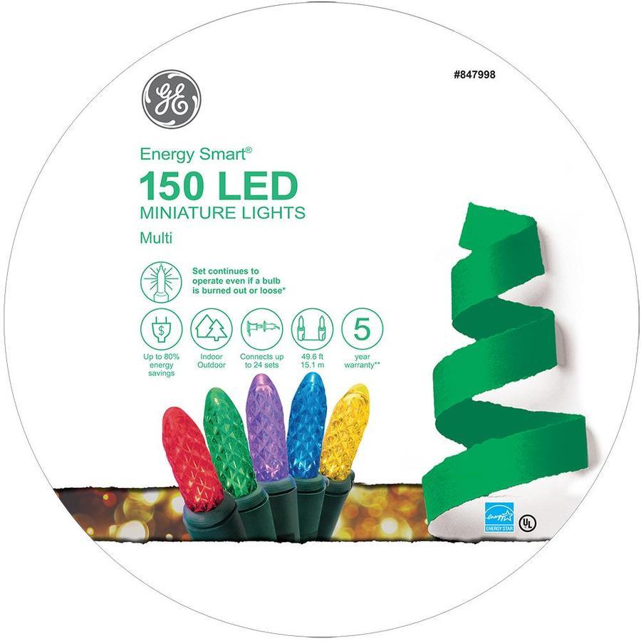150-Count GE Energy Smart ConstantON LED multicolor 7-MM diamond cut Christmas string lights ConstantON lights continue to operate even when a bulb is burned out or loose Green cord with 49.6-ft lighted length matches your Christmas decor and illuminates your home's interior or exterior Can connect with up to 24 sets to make decorating your whole home a breeze ENERGY STAR qualified products help you save money on utility bills without sacrificing performance, style or comfort Replacement bulbs and fuses included for added convenience UL safety listing demonstrates this product has met minimum requirements of widely accepted product safety standards 5-Year limited warranty gives you peace of mind Perfect for Christmas trees, ceilings and roof lines