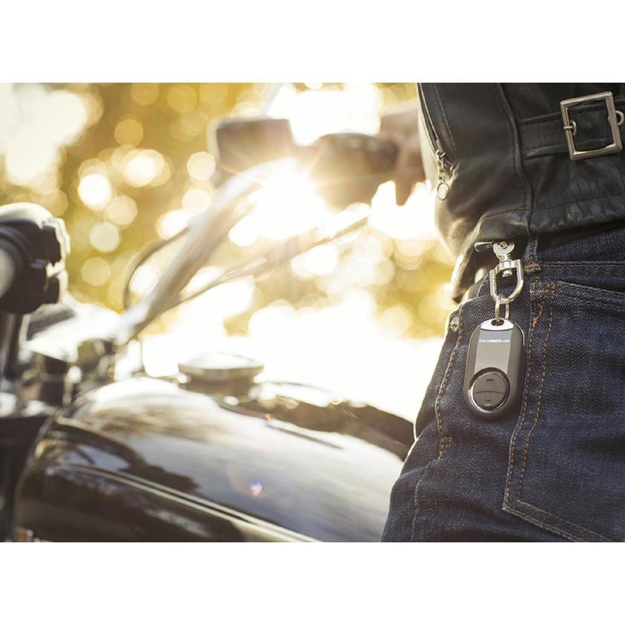 This small, two-button Universal Remote is the perfect option for runners, cyclists or anyone who wants quick access on the go. it can be easily attached to a backpack, car keys or even a dog leash Works with over 90% of all garage door openers, including all major brands such as Chamberlain®, lift master®, Craftsman®, Genie® and many more making it easy to replace, update or consolidate up to two existing remotes Extreme 800-ft range allows you to operate a garage door opener, gate operator, MyQ® light accessory or commercial door operator for immediate access on arrival Offers secure encryption to prevent hacking Universal wireless programming means no cutting into garage wiring or installation of an unsightly receiver Rigorous quality testing ensures lasting performance; scratch-resistant outer shell makes it highly durable Weight 2.4-oz.; 6.5-in H x 0.7-in D x 3.1-in W One-year warranty; online programming video to ensure smooth setup Box includes: key-ring attachment, long-life 3V coin-cell lithium CR2032 battery and instruction manual