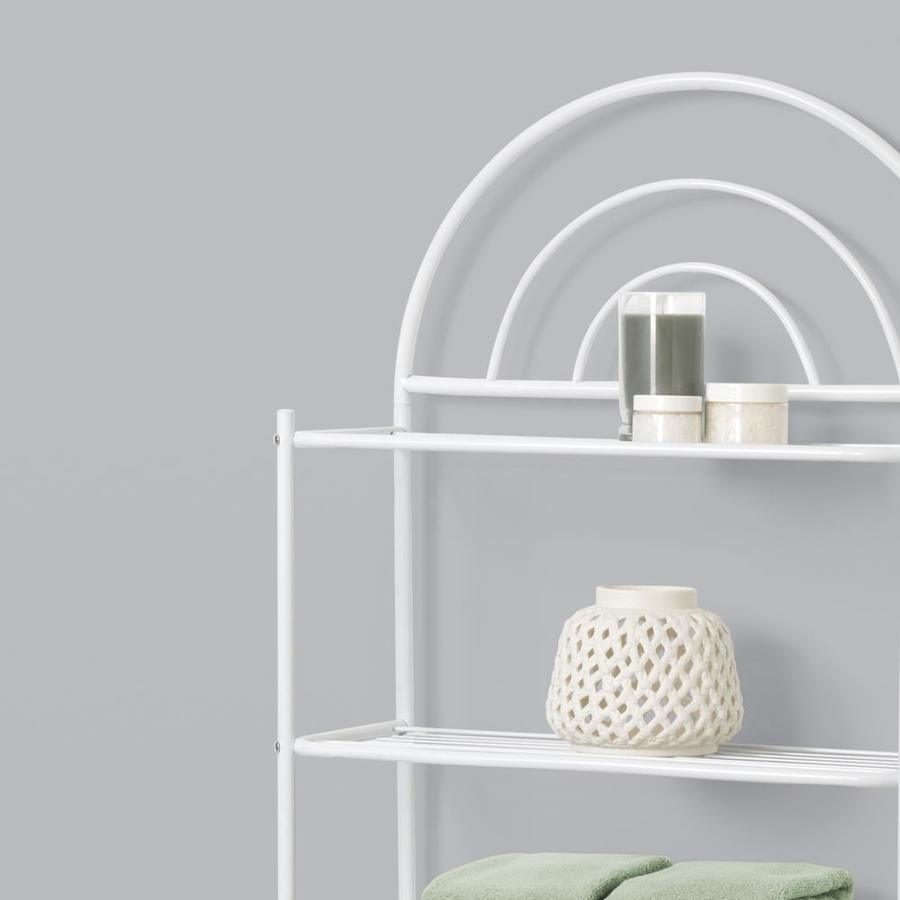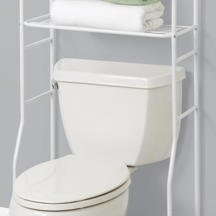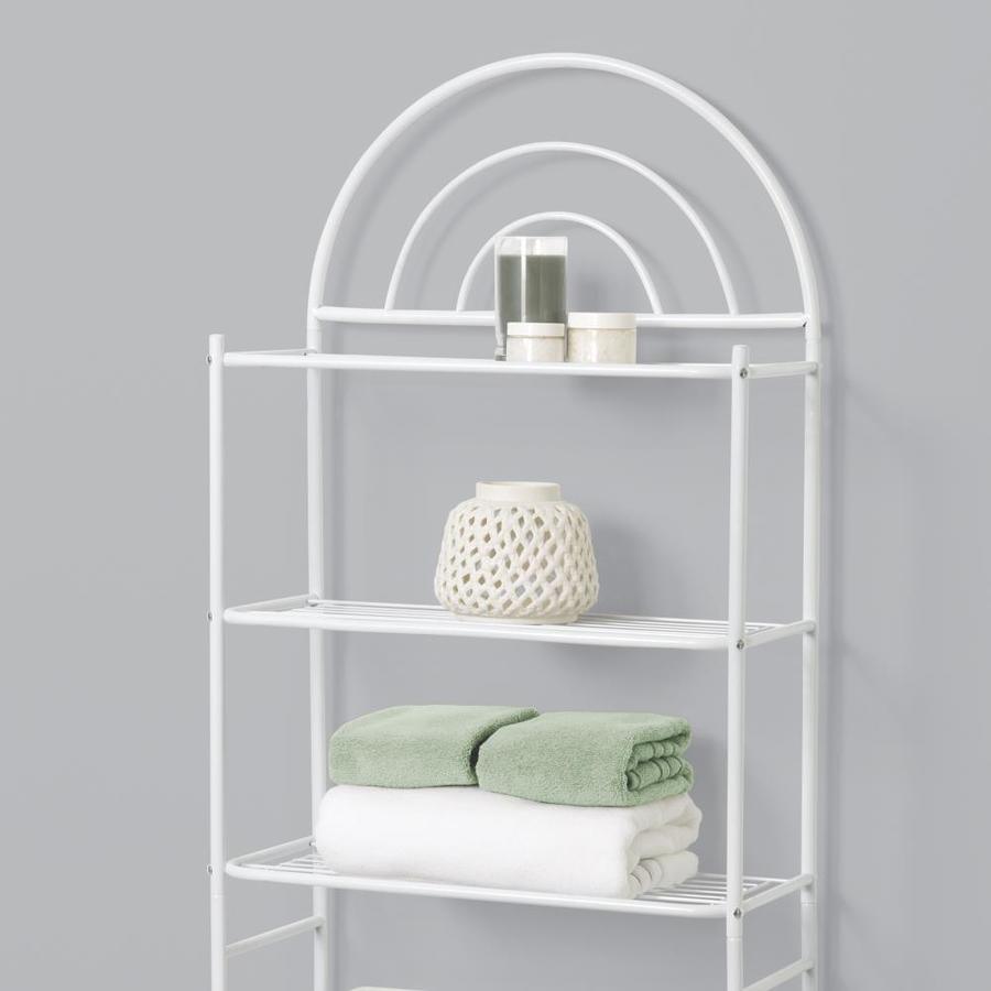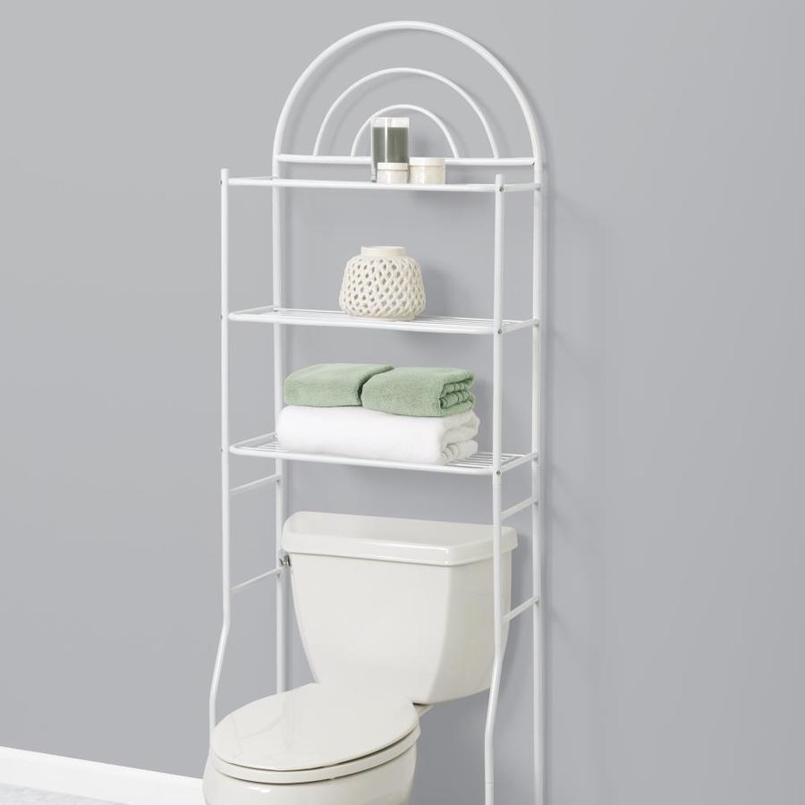 Features 3 wire shelves for above-the-toilet storage Bottom shelf is 34 in. from ground, allowing spacesaver to fit over most standard toilets Decorative arch-style top and white powder-coated finish Stands 68 in. tall Assembles easily, with illustrated instructions included