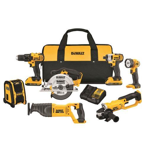 Combo kit includes DCD780 20 V MAX 1/2-in cordless drill, DCF885 20 V MAX cordless impact driver, DCG412 20 V cordless angle grinder, DCS393 20 V MAX circular saw, DCS381 20 V MAX reciprocating saw, DCL040 handheld flashlight, DCR006 portable speaker