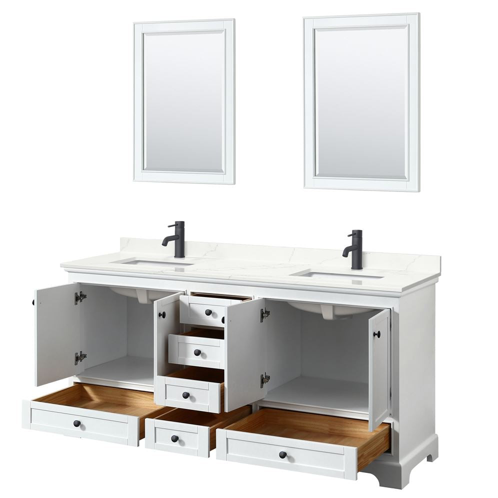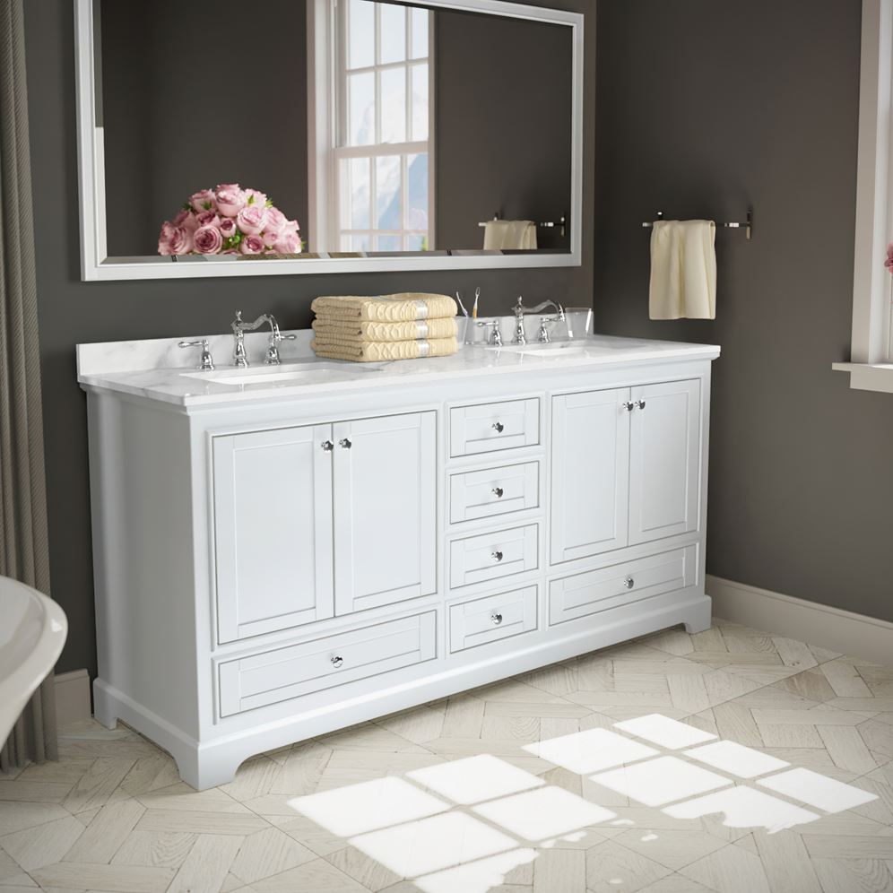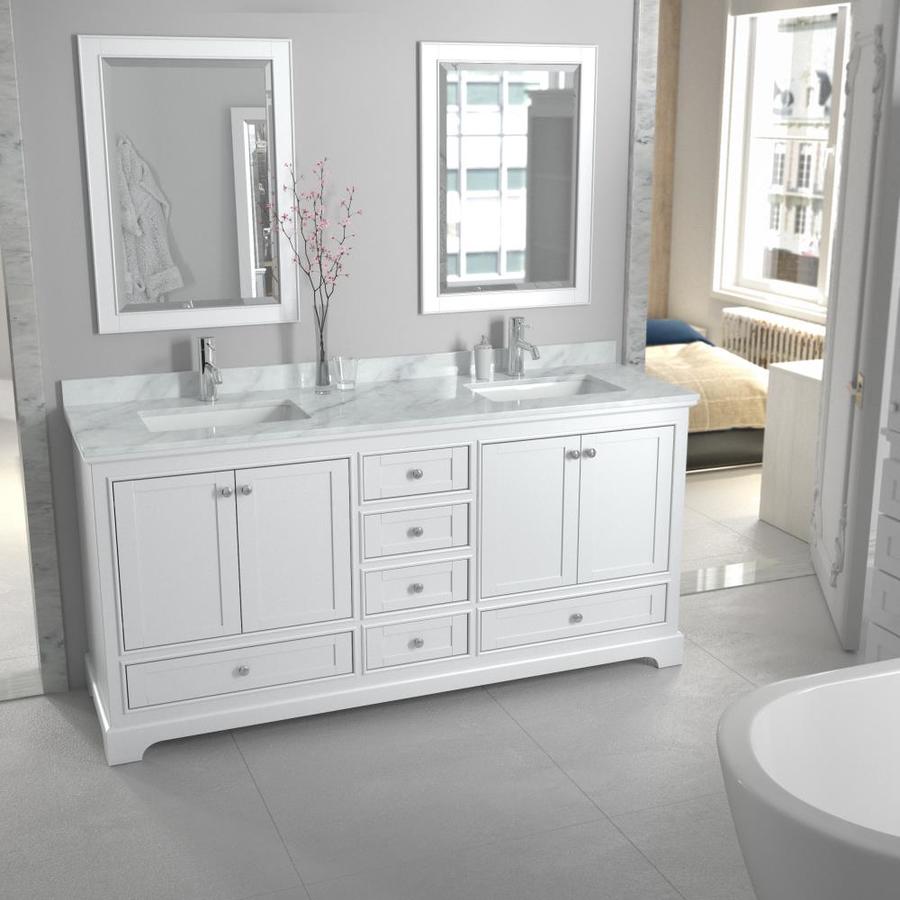 The Deborah 72-inch double vanity by Wyndham Collection pairs classic transitional styling with durable, eco-friendly plywood construction. Finished in water-resistant low-VOC paint and topped with a White Carrara natural marble counter, it features soft-close doors and drawers for everyday luxury and storage.