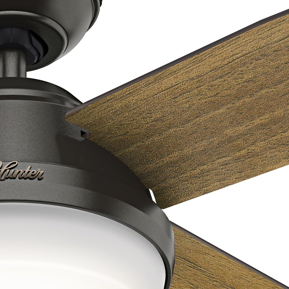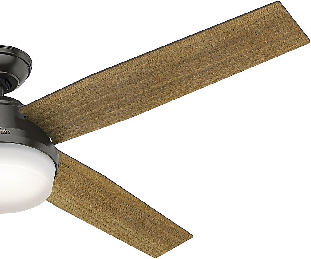 A sleek, modern 60-inch ceiling fan designed for indoor spaces, the Hunter Dempsey pairs reversible wood-tone blades with a cased white glass LED light. It includes a handheld remote and multiple downrod options for optimized airflow and flexible installation.