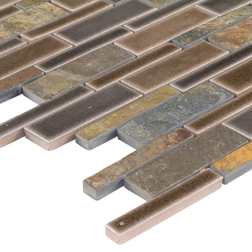 This linear mosaic weaves together earthy tones and sleek, glazed accents to create a quietly dramatic backdrop. The elongated strips add movement, stretching sightlines and lifting even the smallest spaces. Pair it with matte black fixtures and warm wood for a layered, gallery-worthy vignette. It’s the refined touch that makes everyday living feel luxuriously curated.