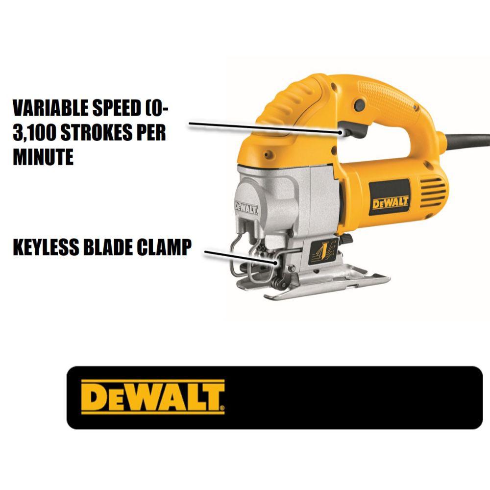 The DEWALT 5.5 Amp Jigsaw Kit delivers a powerful cutting performance in tough materials. The variable-speed trigger delivers 0-3100 SPM to match the speed to the material you're cutting. The 4-position orbital operation provides aggressive cutting of a variety of materials.