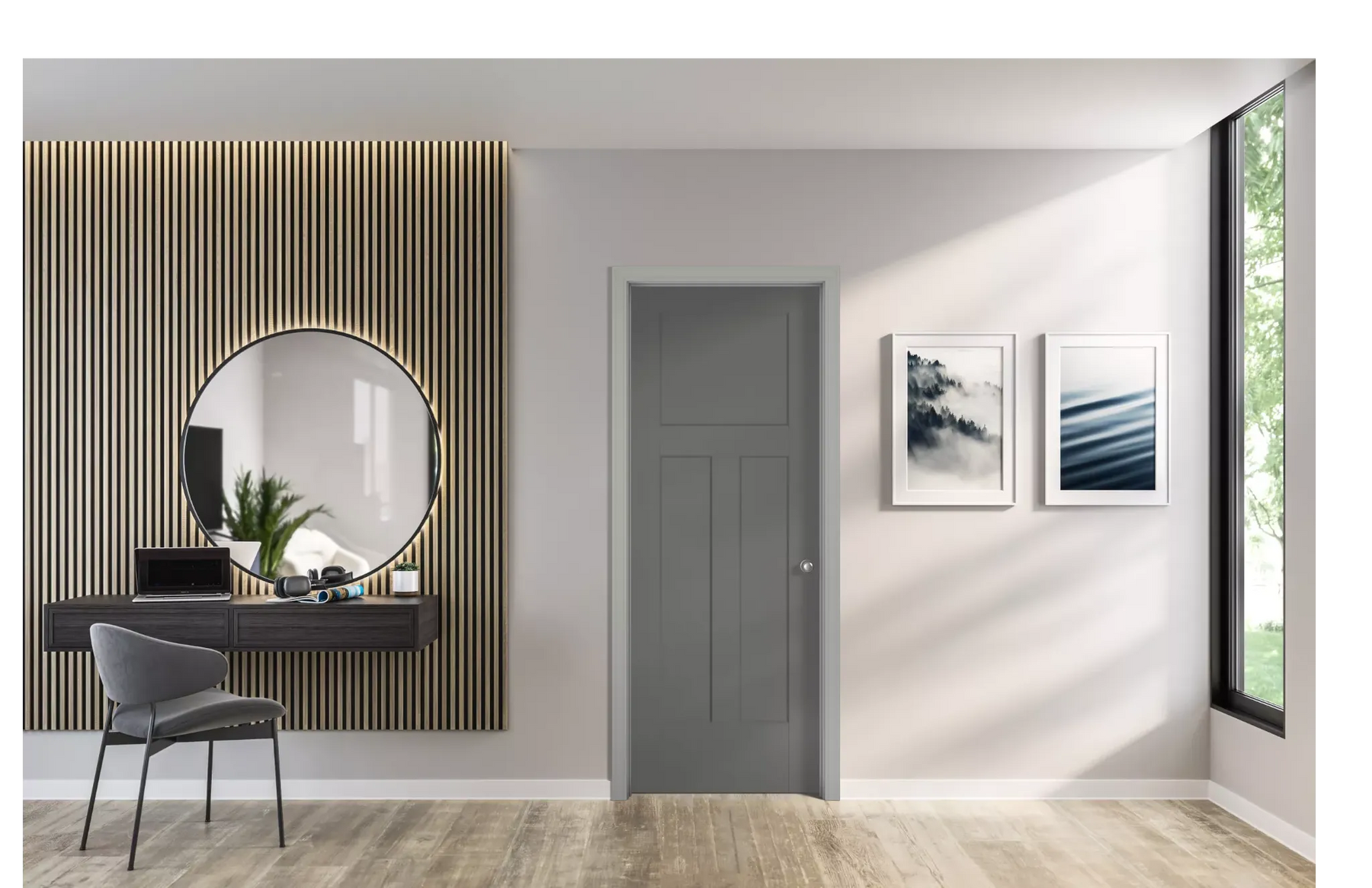 The Winslow’s three-panel geometry brings a tailored, architectural rhythm to any interior. Its solid core gives the door a gratifying weight while keeping the home hushed. Paint it a moody charcoal to punctuate a minimalist hallway, or go soft white for a fresh pantry statement. This is a refined essential that marries performance with polished, everyday luxury.