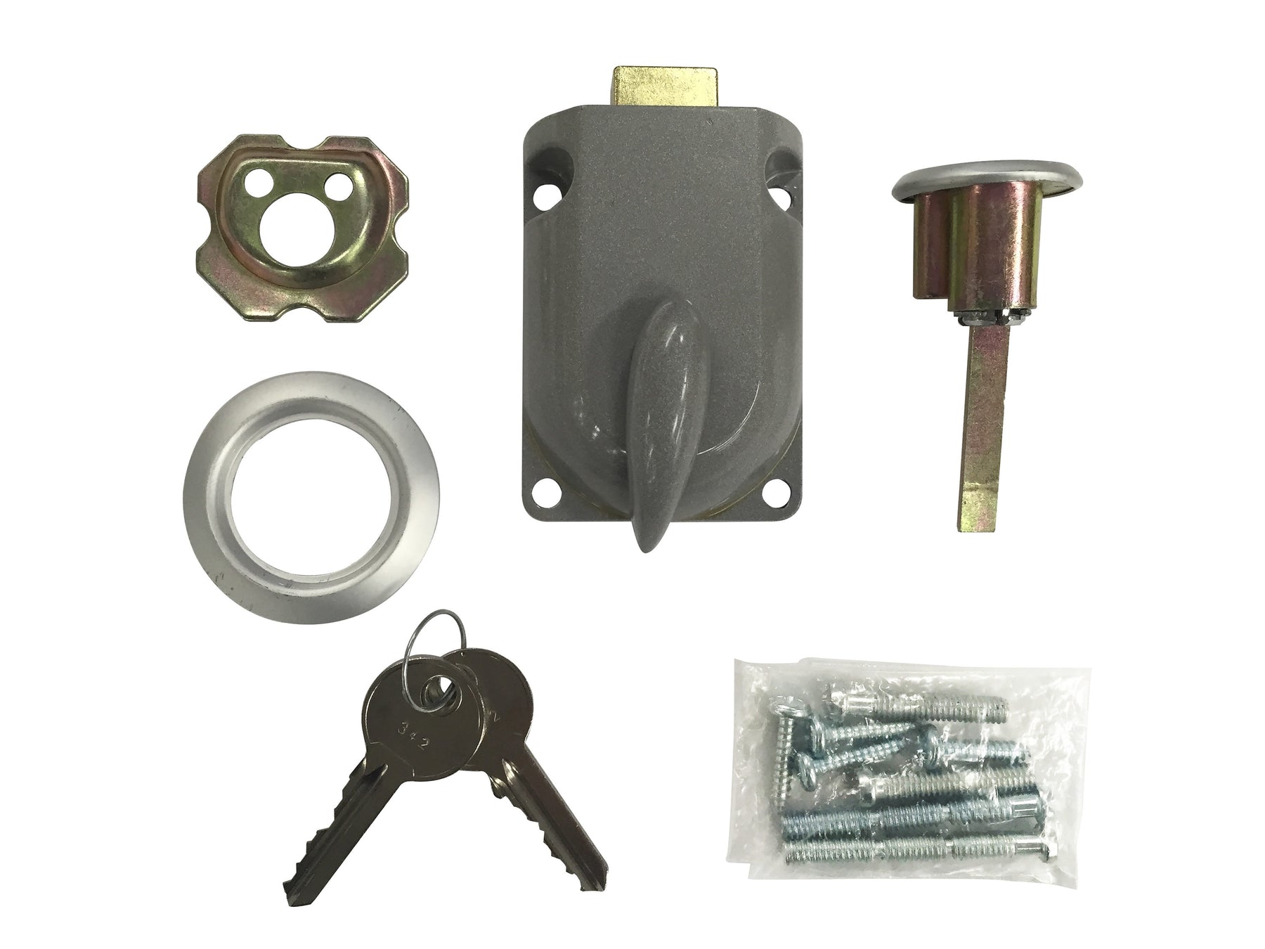 A: Key cylinder (1), keys (2), O-ring (1), plate (1), and mounting hardware.