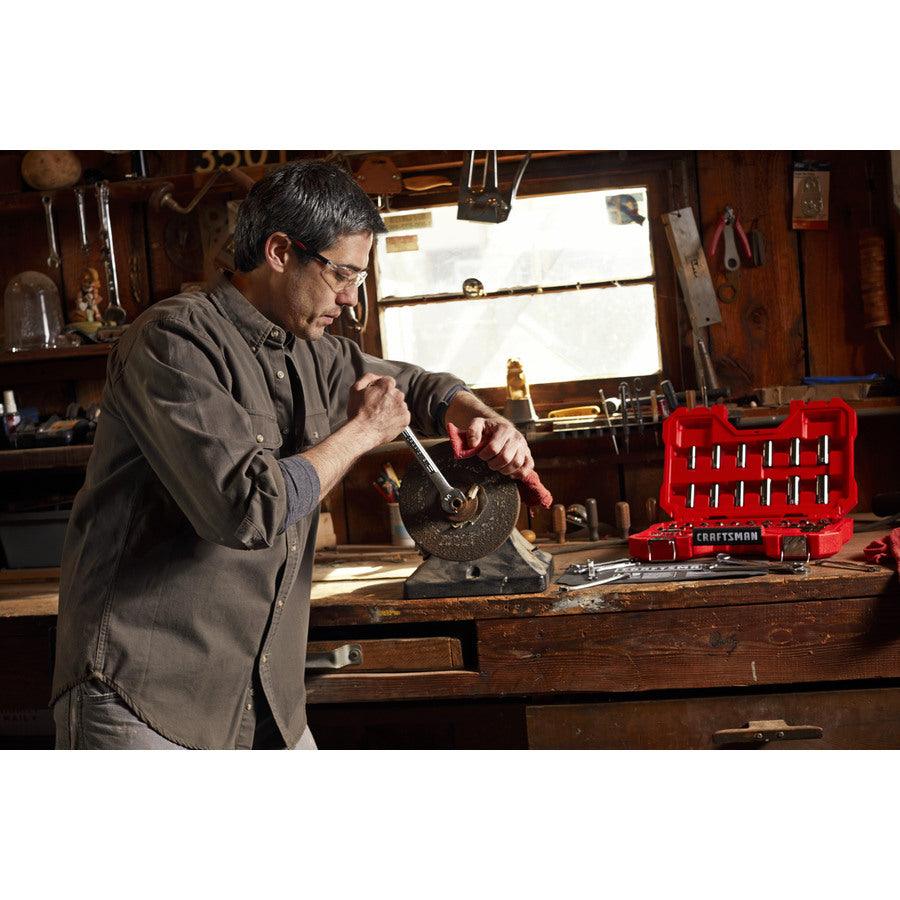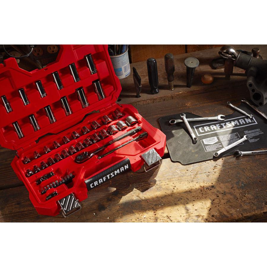 Also includes (6) 3/8-in Drive Deep 6 PT Sockets Metric (10, 12, 13, 14, 15, 17mm), (6) 3/8-in Drive Deep 6 PT Sockets SAE (7/16, 1/2, 9/16, 5/8, 11/16, 3/4-in), (1) 3/8-in Ratchet, (1) 1/4-in Bit Driver, (1) Universal Joint and (1) Extension