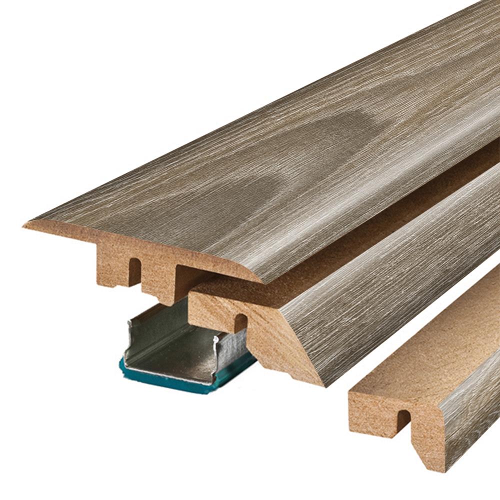 Versatile 4-in-1 floor moulding in Flatiron Oak finishes transitions with style and durability. Made from prefinished MDF, it snaps into a track to serve as T-moulding, hard surface reducer, carpet transition, or end molding.