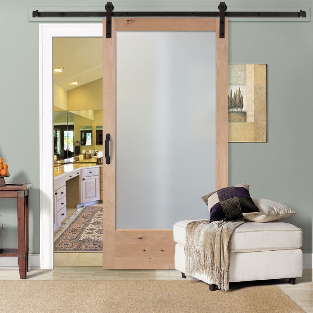A natural knotty alder sliding barn door with frosted full-lite glass delivers privacy and light in one elegant slab. Unfinished wood lets you stain to match your décor, and the solid-core construction adds durability and authentic heft.