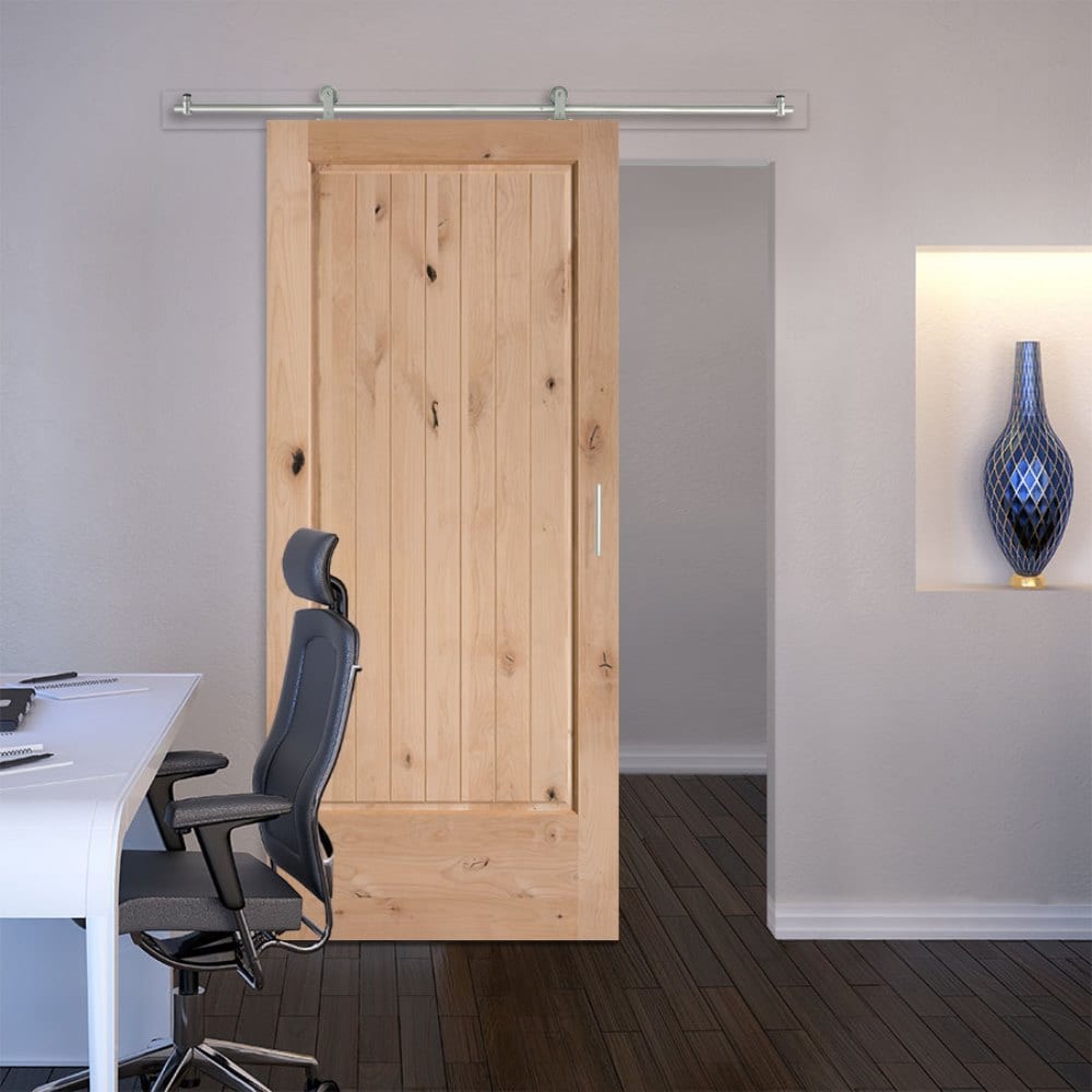 This barn door infuses a room with the organic poetry of knotty pine—those soft grains and scattered knots feel both nostalgic and fresh. The single plank panel reads clean and architectural, letting the wood’s character take center stage. Pair it with matte black hardware against plaster-white walls for a modern farmhouse moment, or stain it deep walnut for moody sophistication. It’s a chic essential that turns circulation into a curated design gesture.