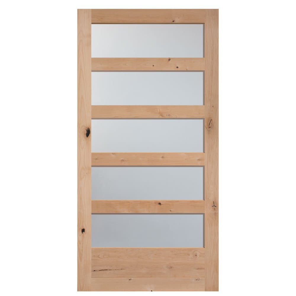Bring natural warmth and modern lines to your interior with this Masonite single barn door. Crafted from knotty alder with a solid-core construction, it arrives unfinished and ready to stain, featuring five frosted-glass lites that invite light while preserving privacy. Ideal as a space-saving solution for closets, pantries, offices, and baths.