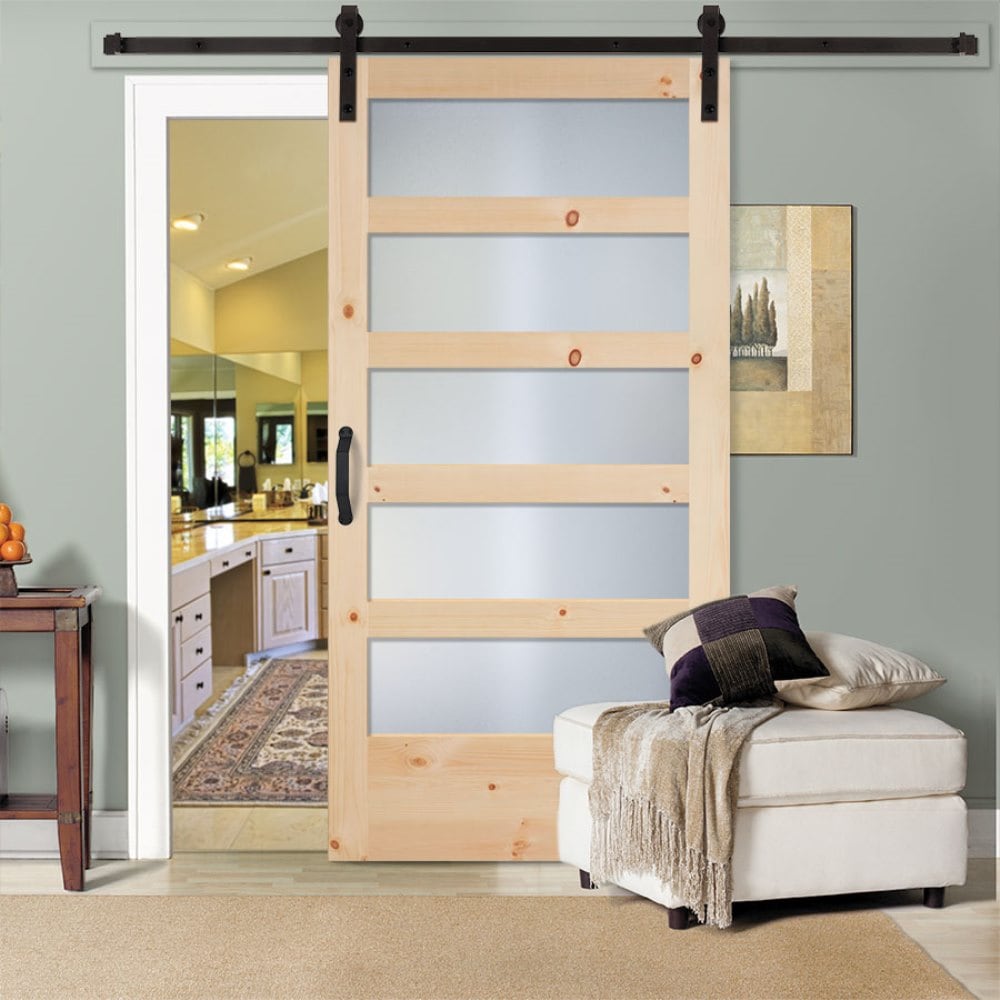 This Masonite interior barn door features a natural unfinished knotty pine frame with five frosted-glass lites for high privacy and luminous light flow. The solid-core slab is ready to stain and installs on a barn door track system to elevate closets, pantries, baths, and more.