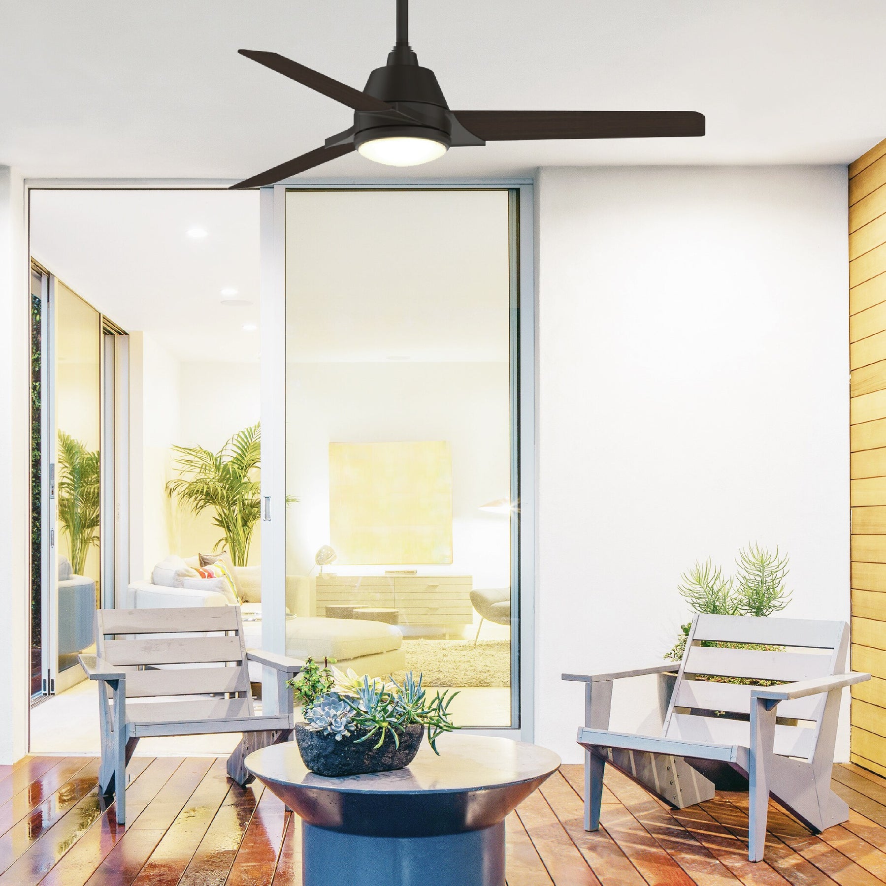 A damp-rated, 52-inch ceiling fan designed for indoor and covered outdoor spaces. It features a 3-speed energy-efficient AC motor, integrated dimmable 18W LED light with frosted glass, and a handheld remote for easy control.