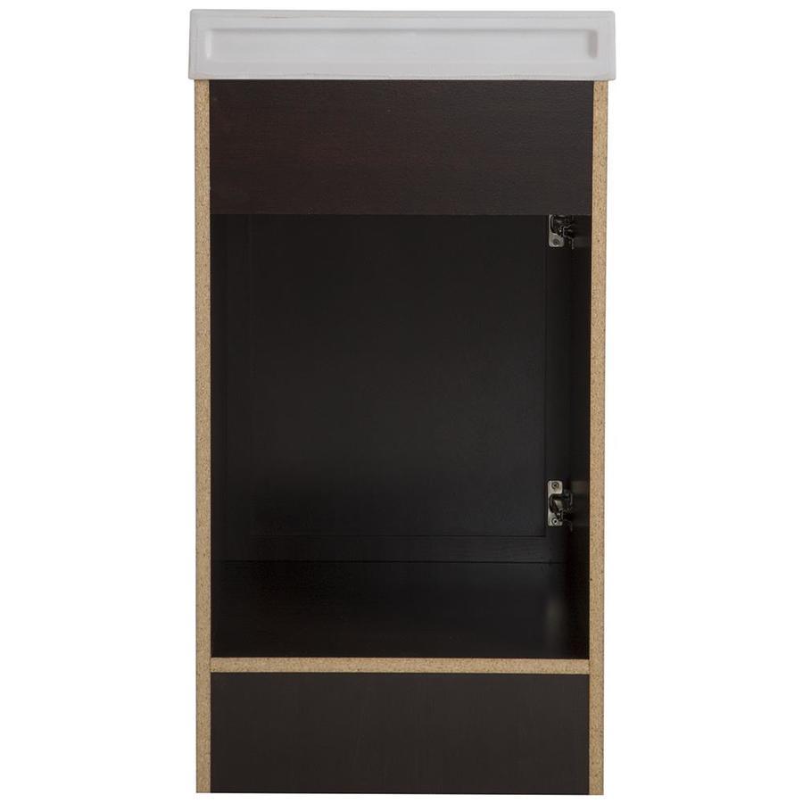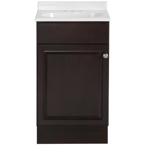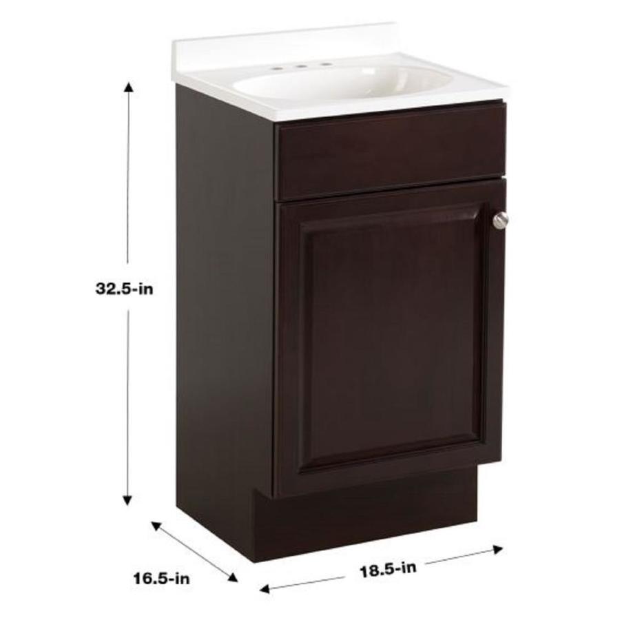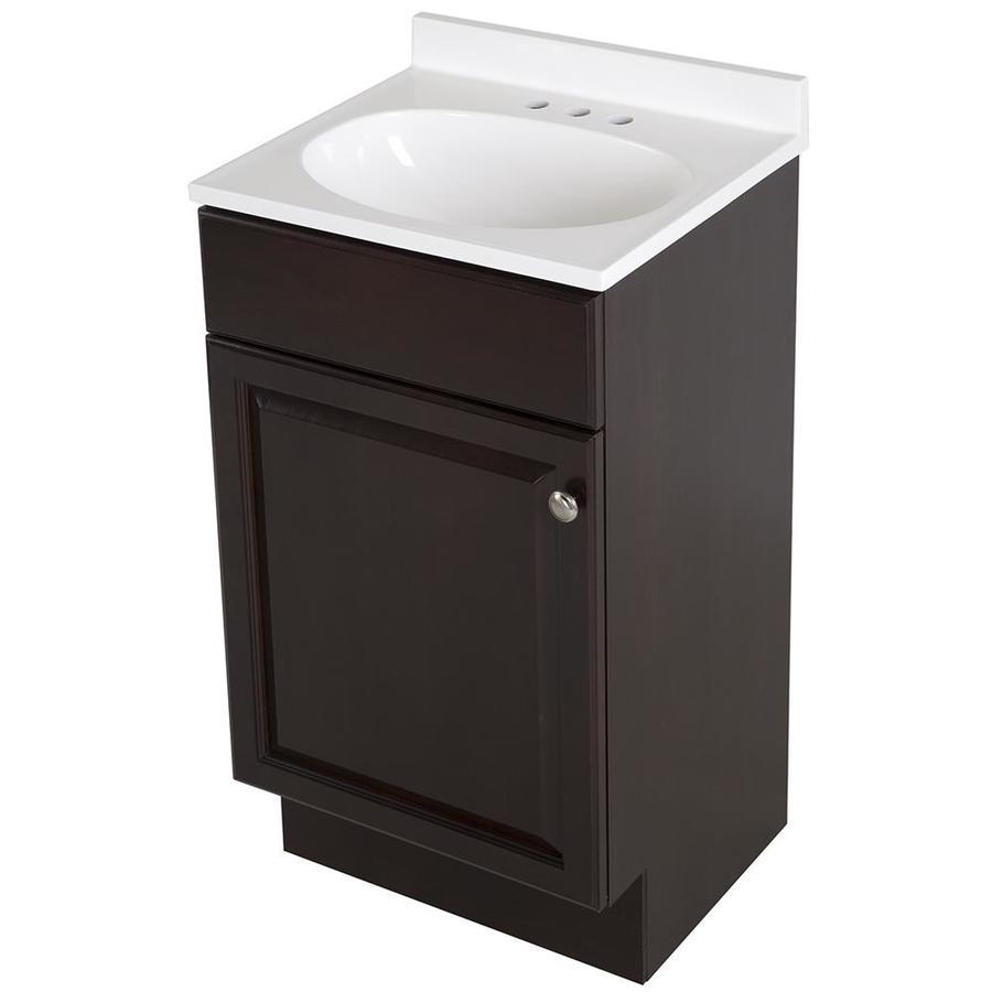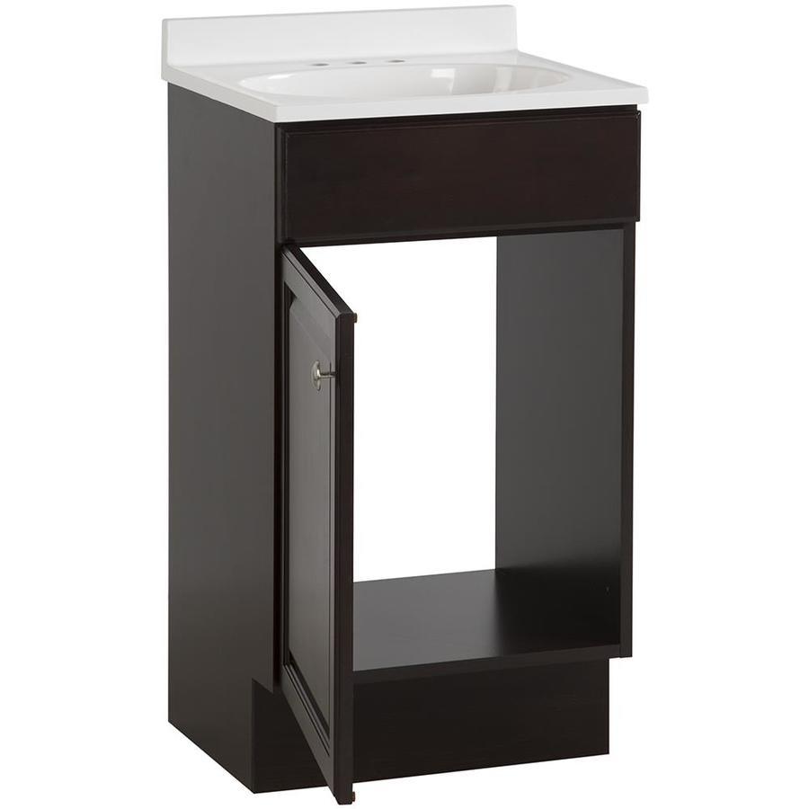 Compact and stylish, this 18-in Project Source vanity features a rich Java finish and a seamless white cultured marble top with an integrated oval sink. Designed for small baths and powder rooms, it arrives fully assembled for quick, freestanding installation.
