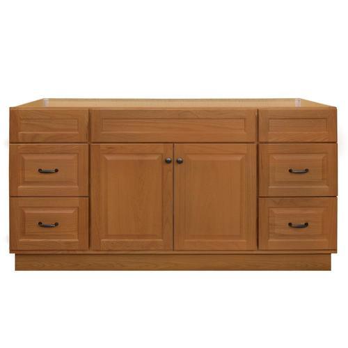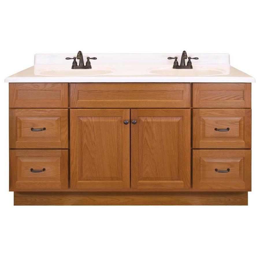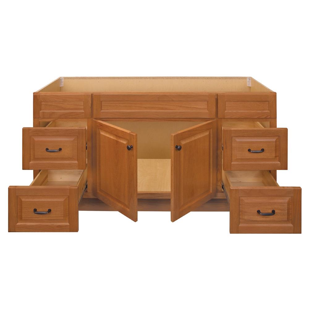 A durable 60-inch freestanding bathroom vanity base in a warm Golden finish from Project Source. Built with a solid oak wood frame and engineered wood panels, it offers ample storage with four drawers and two doors, ready for pairing with a 61-in x 22-in vanity top.