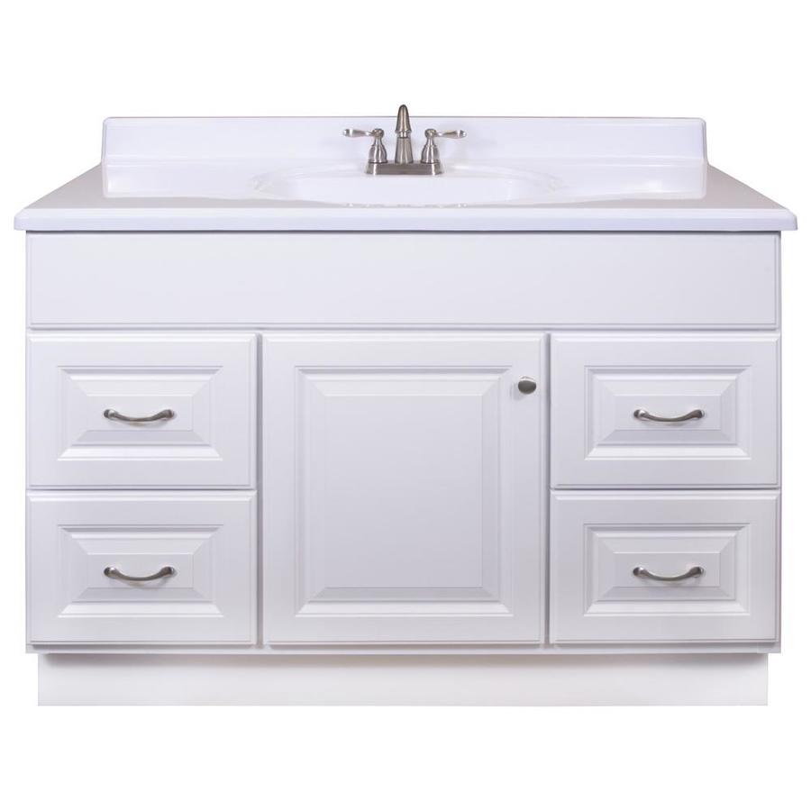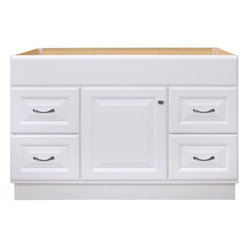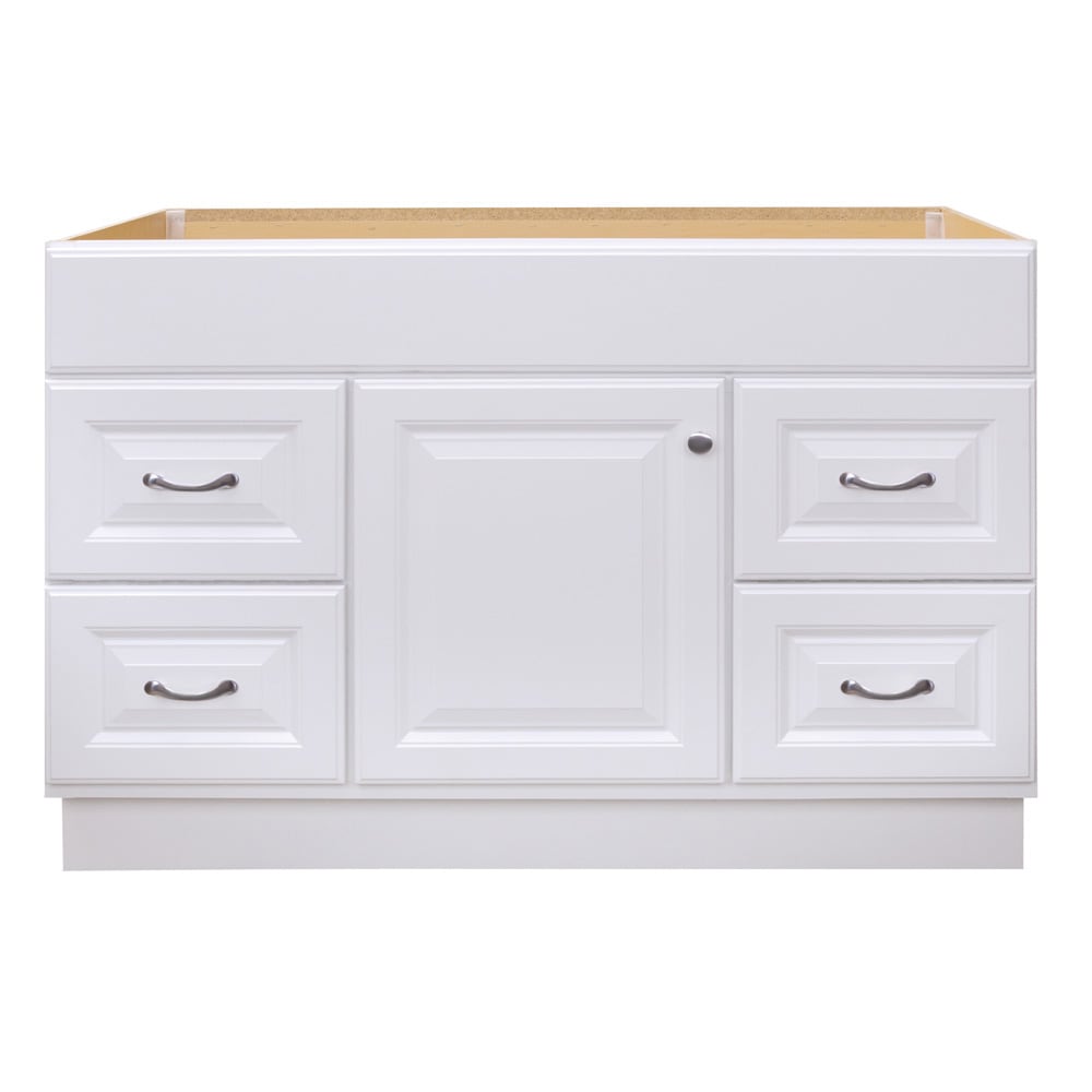 A timeless white freestanding vanity base built for daily durability and easy installation. Face-frame construction with brushed nickel hardware, one door, and four large-capacity drawers offer organized storage for master bath upgrades. Designed to pair with 49-in x 22-in vanity tops (sold separately).