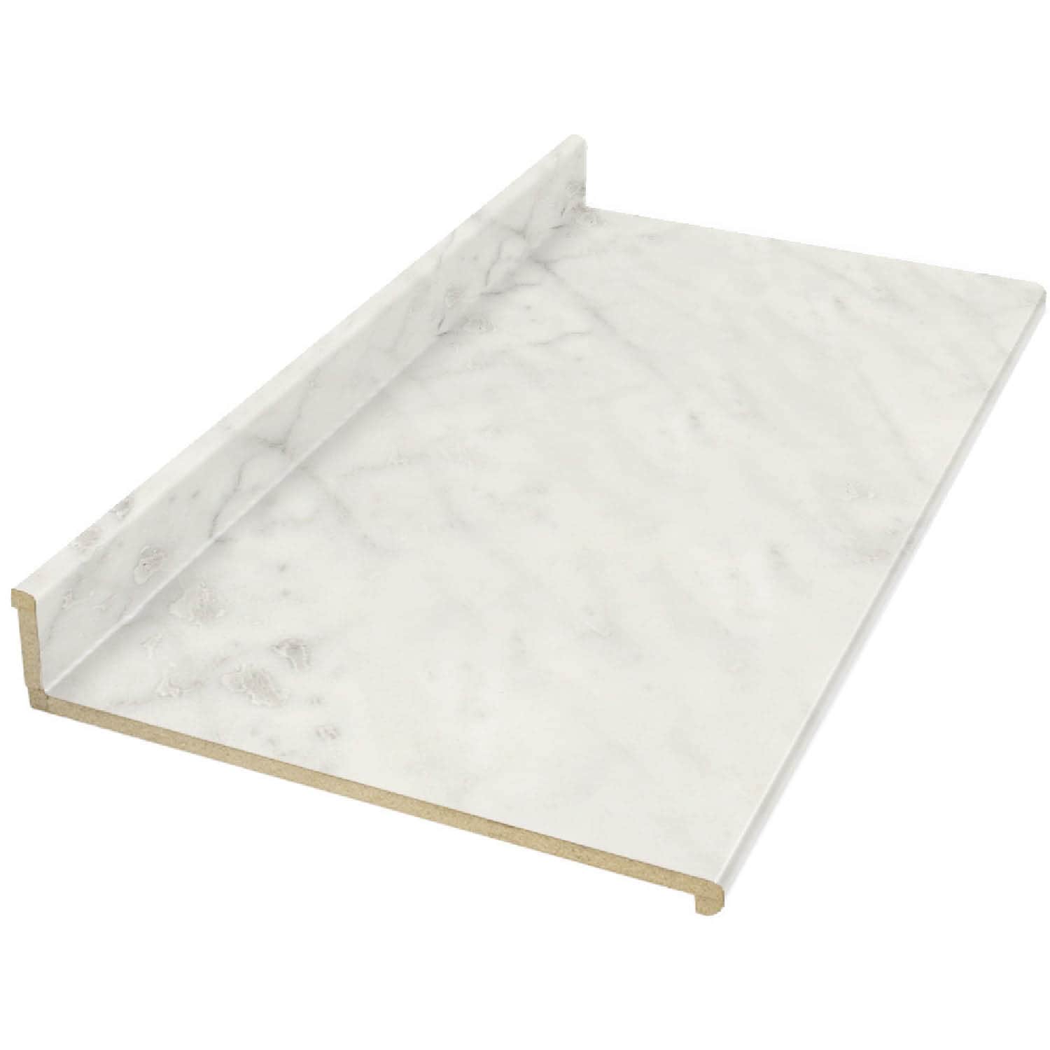 A durable, marble-look laminate countertop in Carrara Bianco with an Ora full-wrap edge and integrated backsplash. Designed for easy DIY installation, it offers stain, scratch, and scuff resistance with low-maintenance performance across kitchens, baths, and workspaces.
