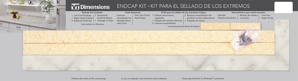Q: What’s included in the kit? A: One left-hand end cap, one right-hand end cap, two build-up end strips, two backsplash build-up blocks, nails, and instructions.