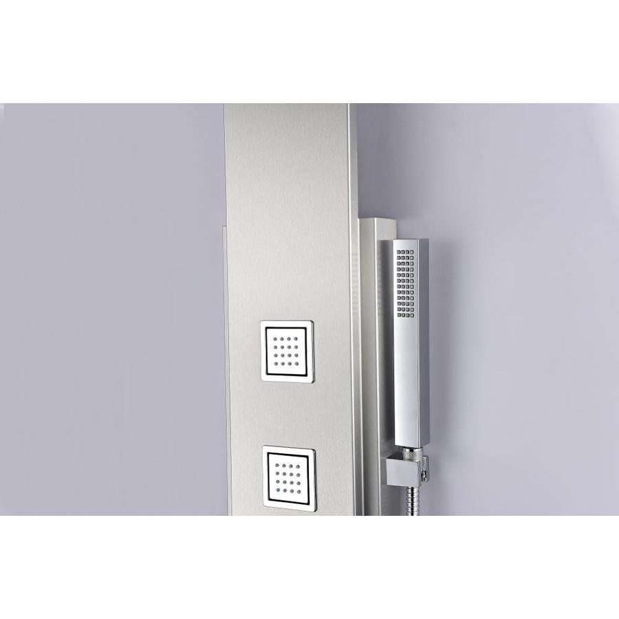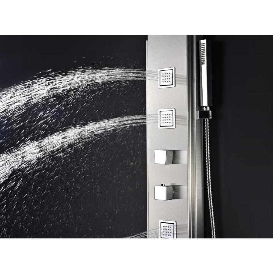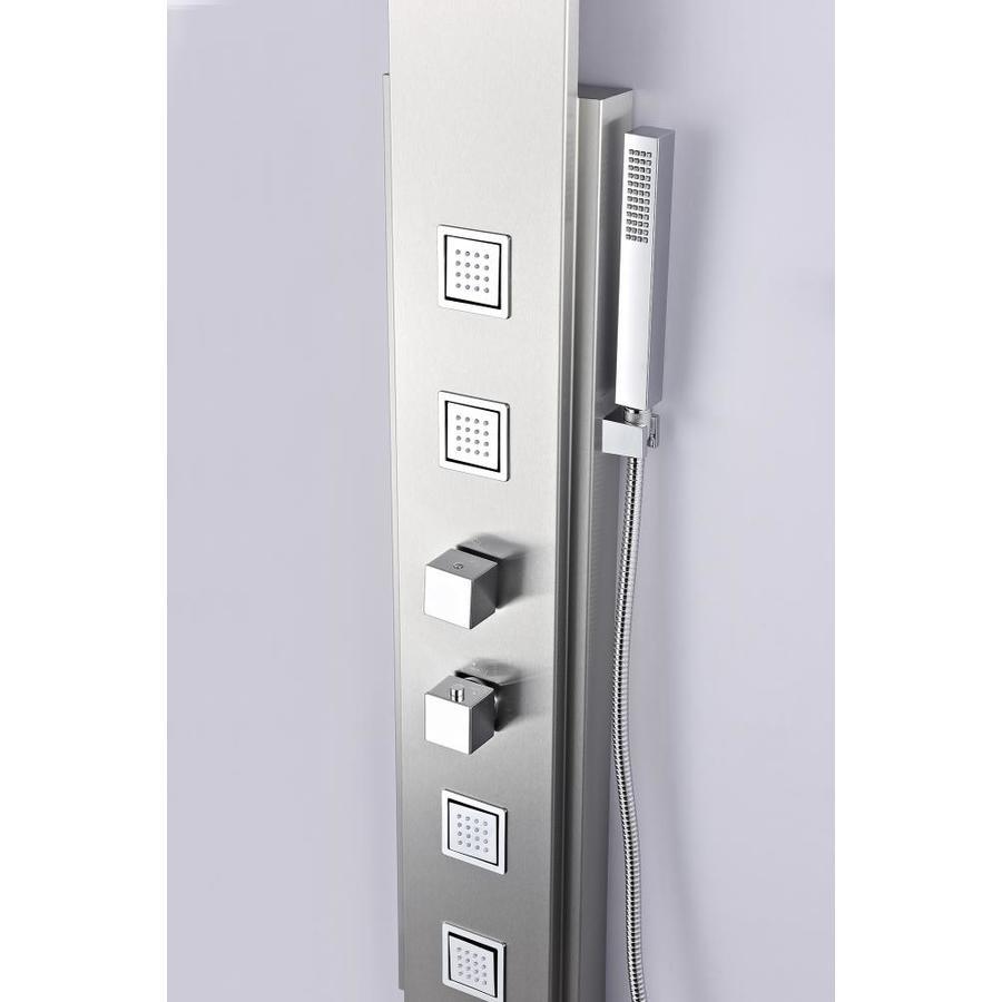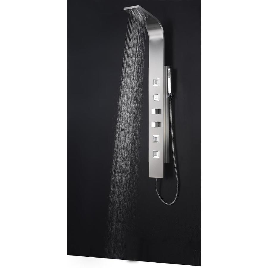 Upgrade your bath with ANZZI’s Visor shower panel, crafted from RHINO ALLOY 304 stainless steel in a brushed steel finish. It features a Heavy Rain overhead shower, 4 Acu-Stream body jets, and a Euro-Grip handheld sprayer, all controlled by thermostatic and diverter knobs with a solid brass valve interior.
