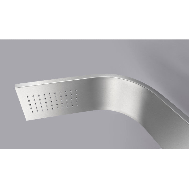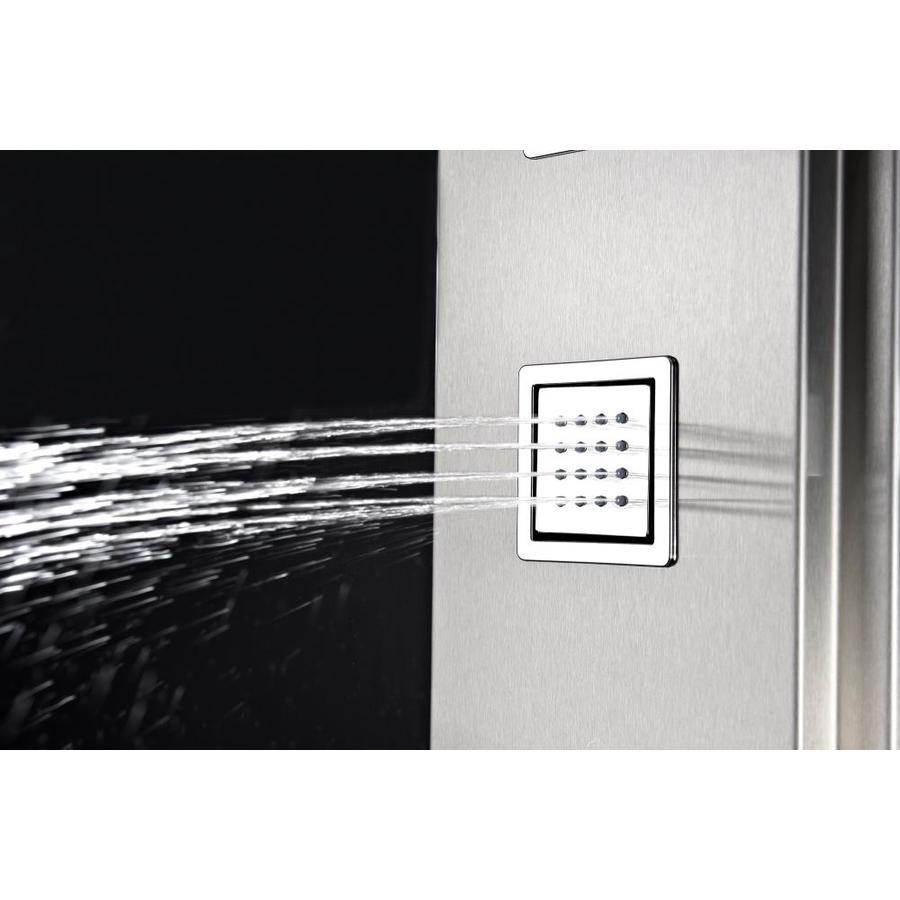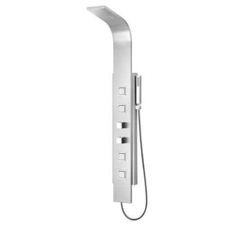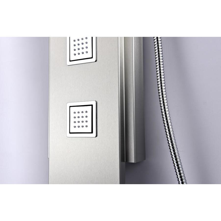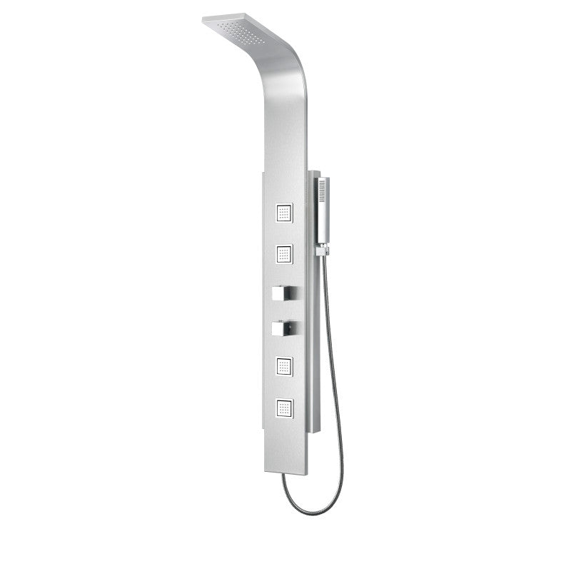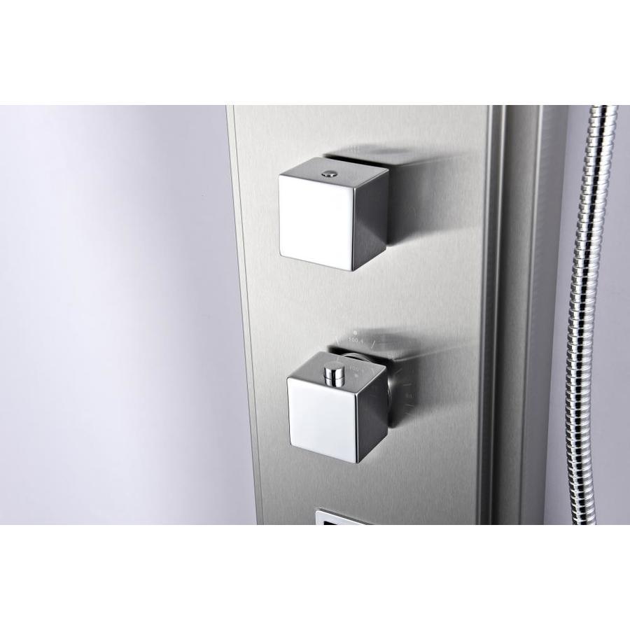 Upgrade your bath with ANZZI’s Visor shower panel, crafted from RHINO ALLOY 304 stainless steel in a brushed steel finish. It features a Heavy Rain overhead shower, 4 Acu-Stream body jets, and a Euro-Grip handheld sprayer, all controlled by thermostatic and diverter knobs with a solid brass valve interior.