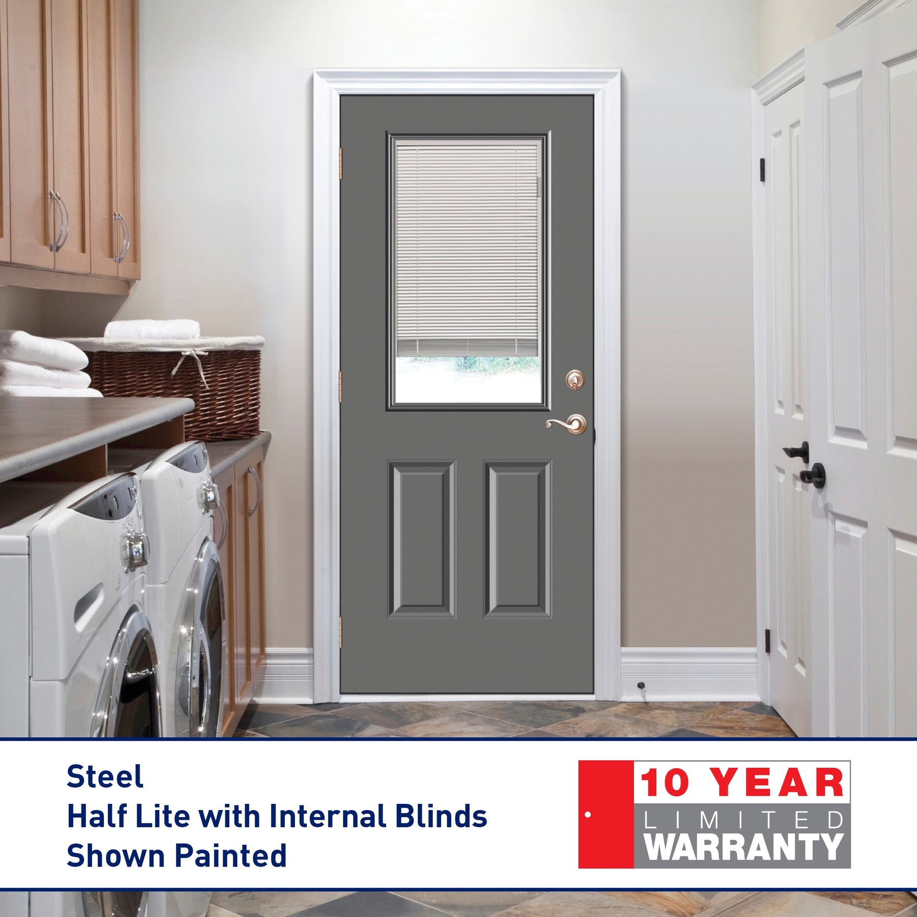 Prehung steel entry door primed and ready to paint, featuring a half-lite Low-E glass with internal blinds for adjustable privacy. Complete system includes jambs, weatherstrip, adjustable sill, and hinges for a precise, long-lasting fit.
