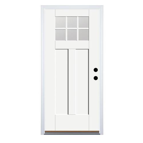 Durable fiberglass Craftsman entry door prehung for easy installation and built with an insulating core for year-round comfort. Smooth, unfinished surface arrives ready to paint and features flush-glazed Low-E clear glass with simulated divided lites. Brickmould and self-aligning hinges are included for a tight, weather-resistant seal.