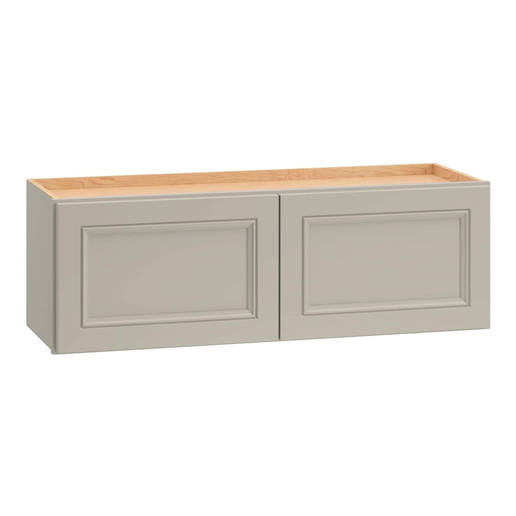 Fully assembled wall cabinet with Wintucket recessed-panel doors in durable TrueColor Cloud Gray laminate. Engineered wood construction with solid back and I-beam braces provides stability and easy installation.