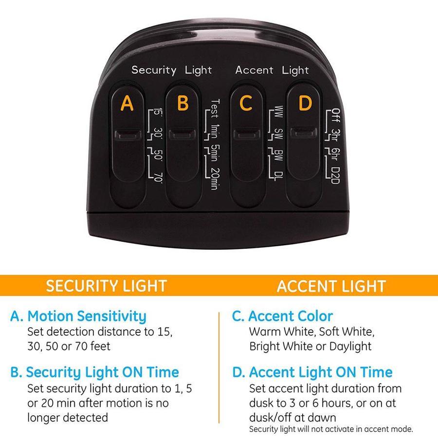 Then choose your accent light time, either dusk to 3 hrs or 6 hrs, or choose all night with built-in DUSK to DAWN sensor or no accent light at all. While accent setting is in use, the security light will not be activated