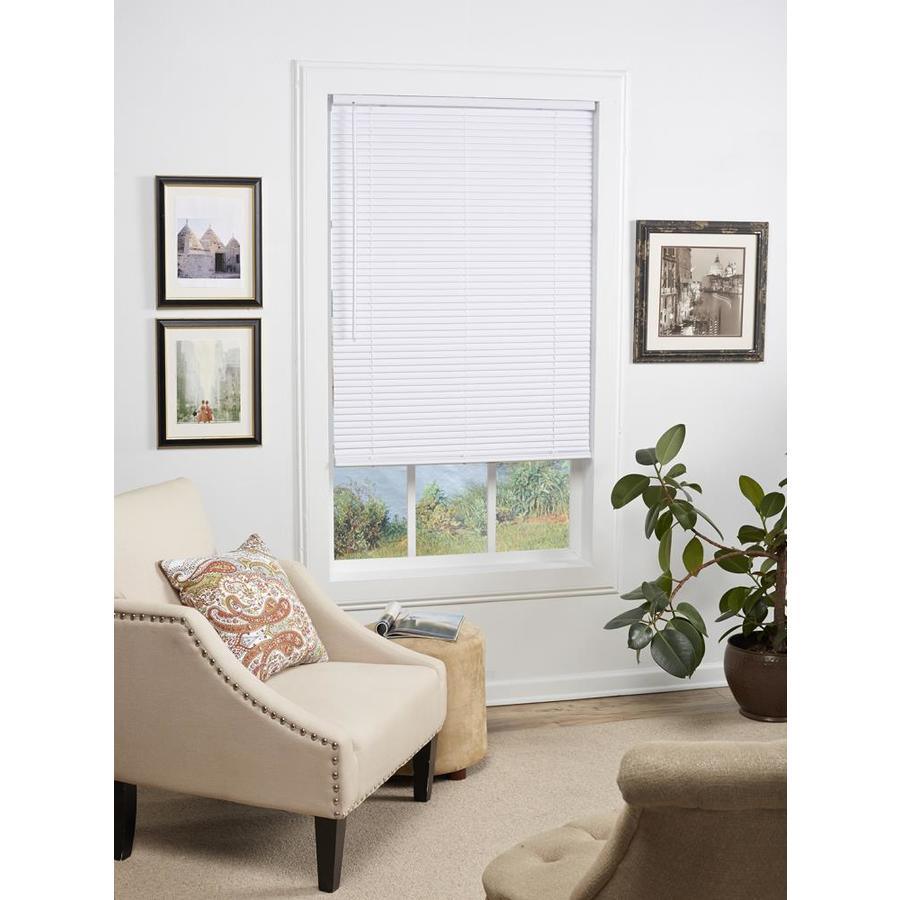 These Project Source cordless vinyl mini blinds provide reliable room darkening with 1-inch slats and a sleek, low-profile headrail. Durable, moisture-resistant vinyl is easy to clean, while the cordless lift and wand tilt offer safe, simple operation ideal for busy households.