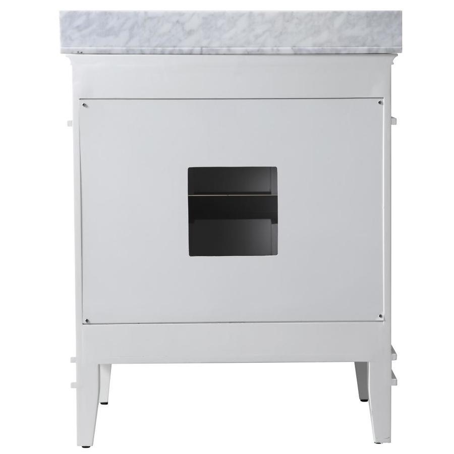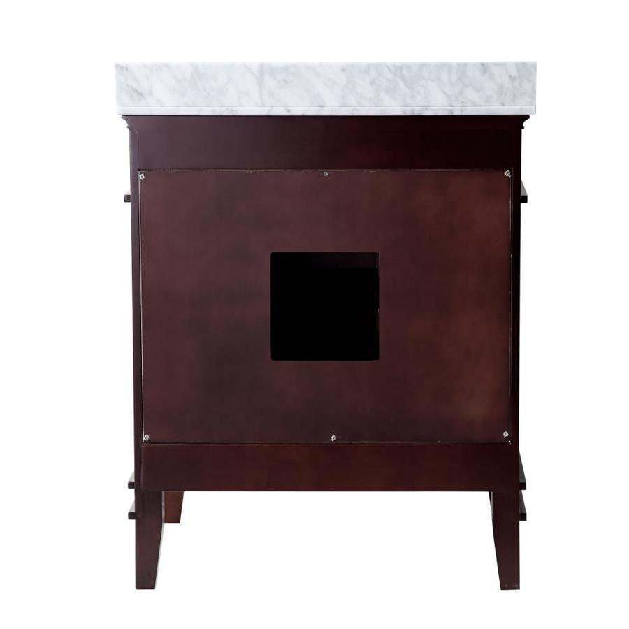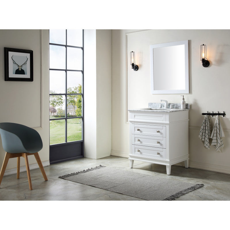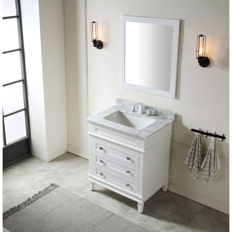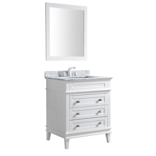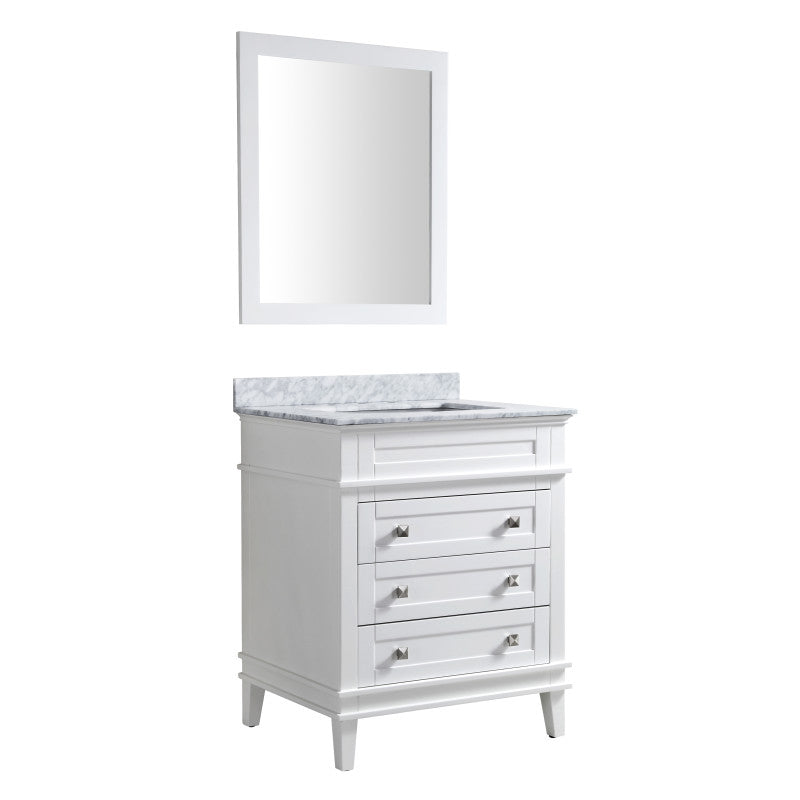 Included Components Vanity body, Carrara marble top, white ceramic sink, wall-mounted mirror, polished chrome hardware