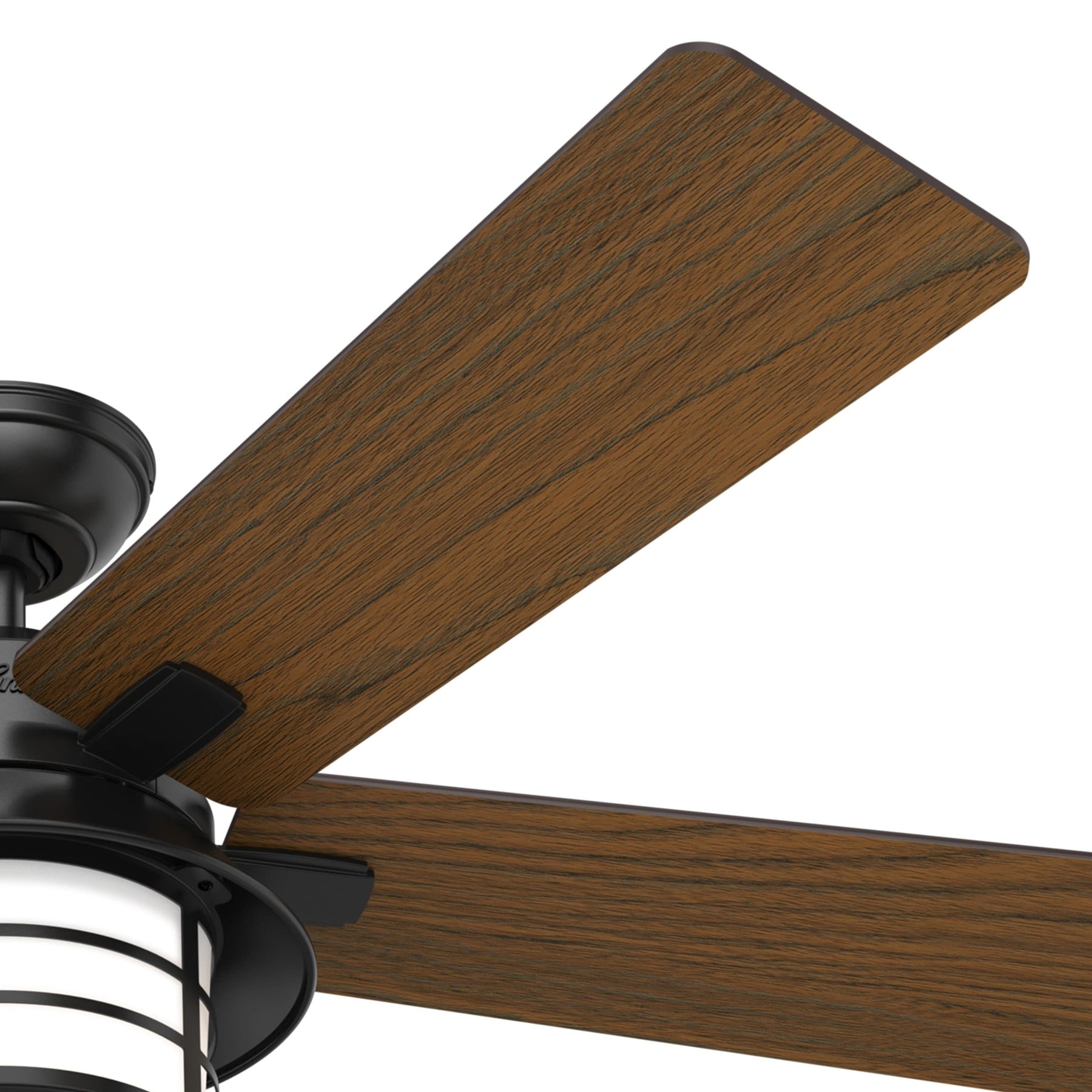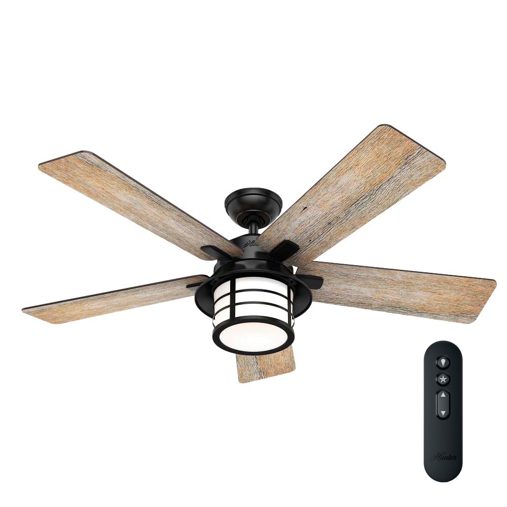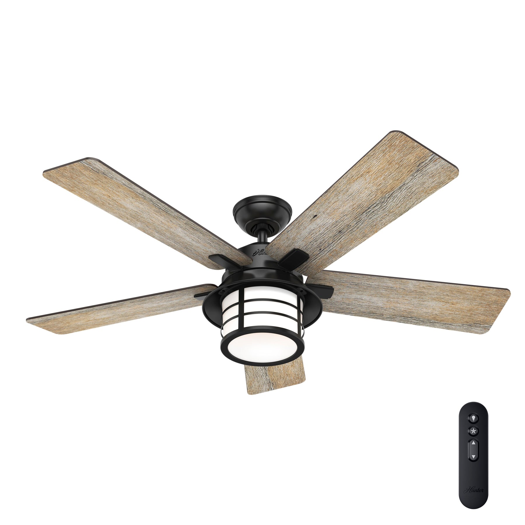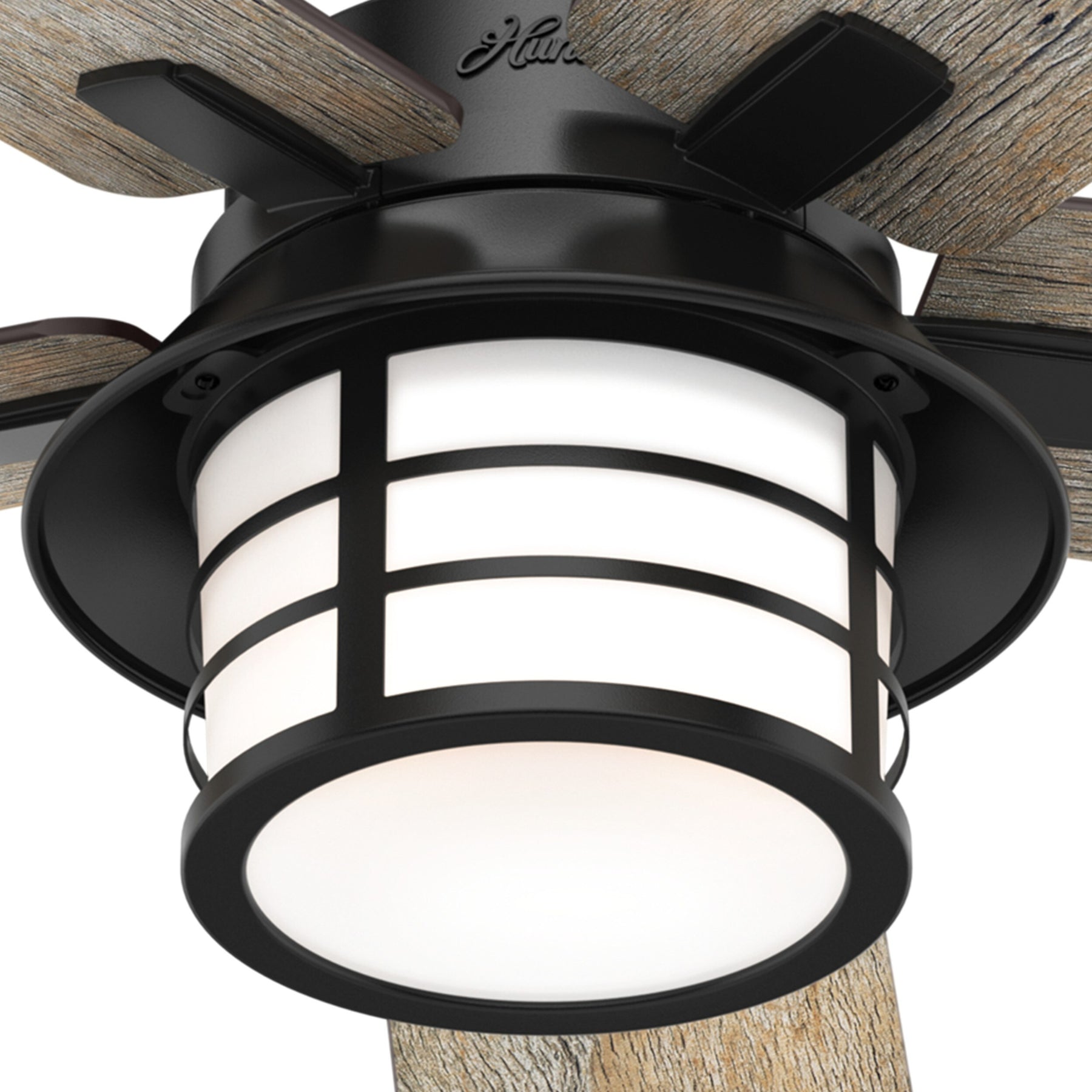The Hunter Lantern Bay ceiling fan delivers coastal-inspired style with a matte black housing and reversible Barnwood/Medium Oak blades. Its WhisperWind AC motor provides quiet, powerful airflow, while the damp rating and integrated dimmable LED light make it ideal for covered patios, sunrooms, and large indoor spaces.