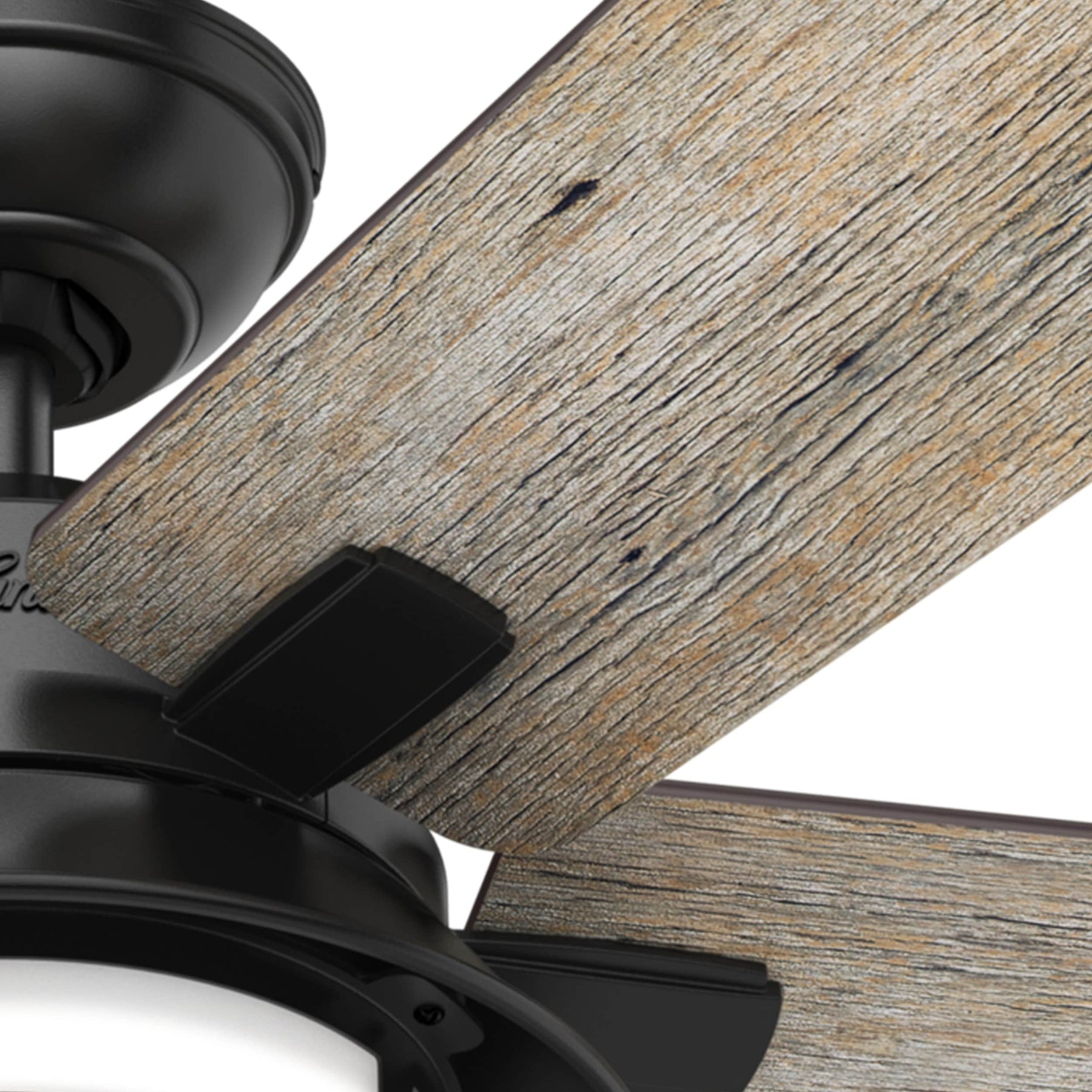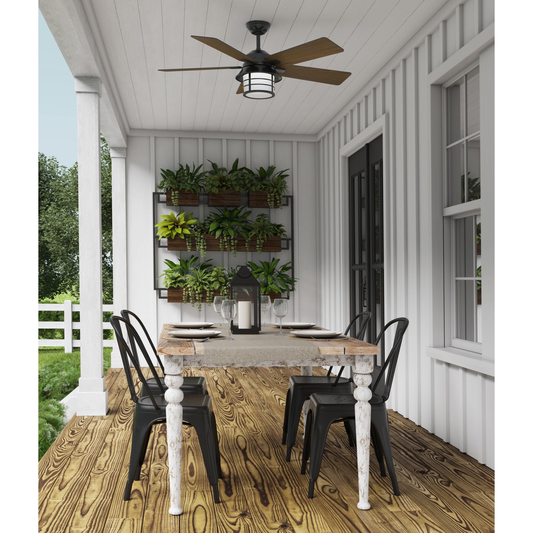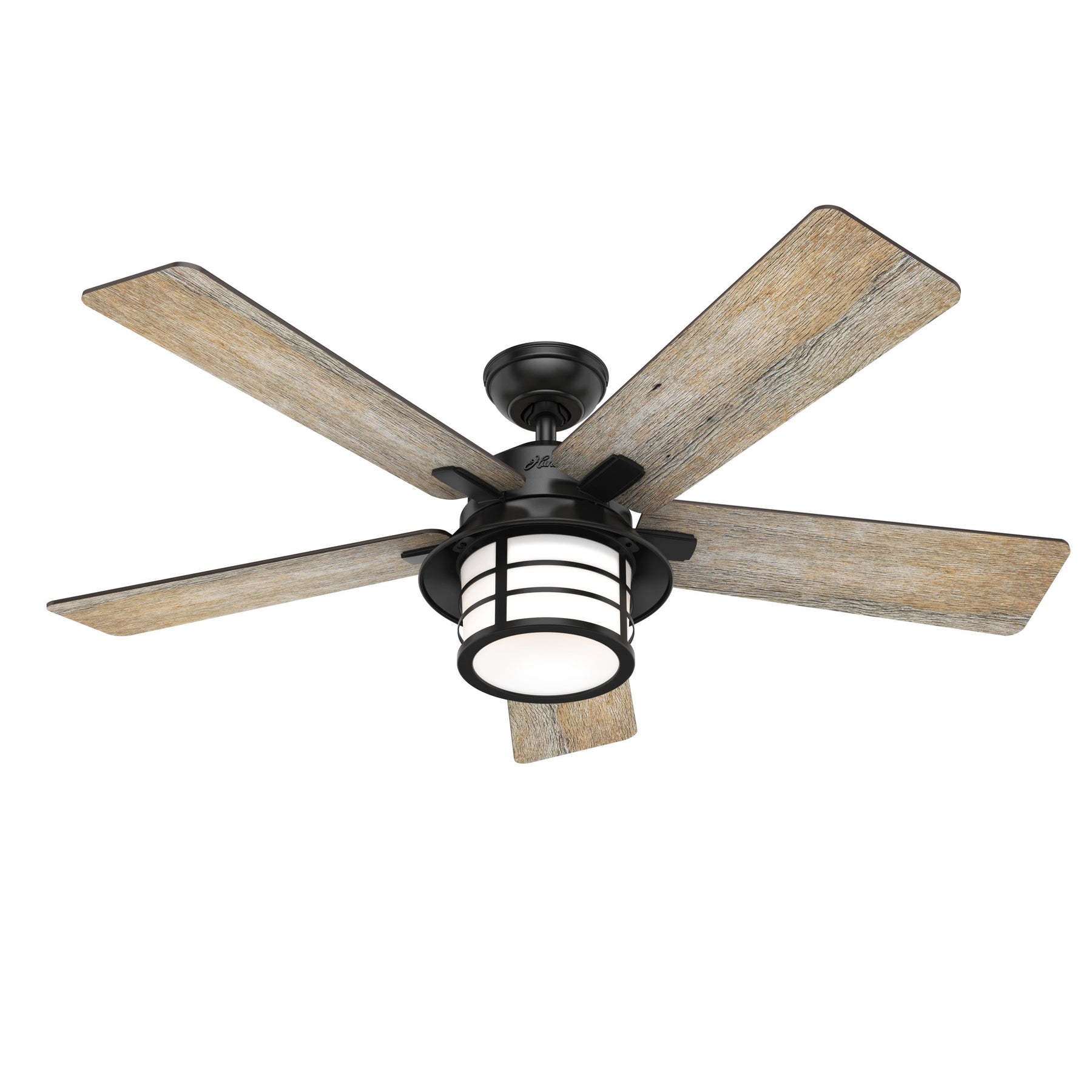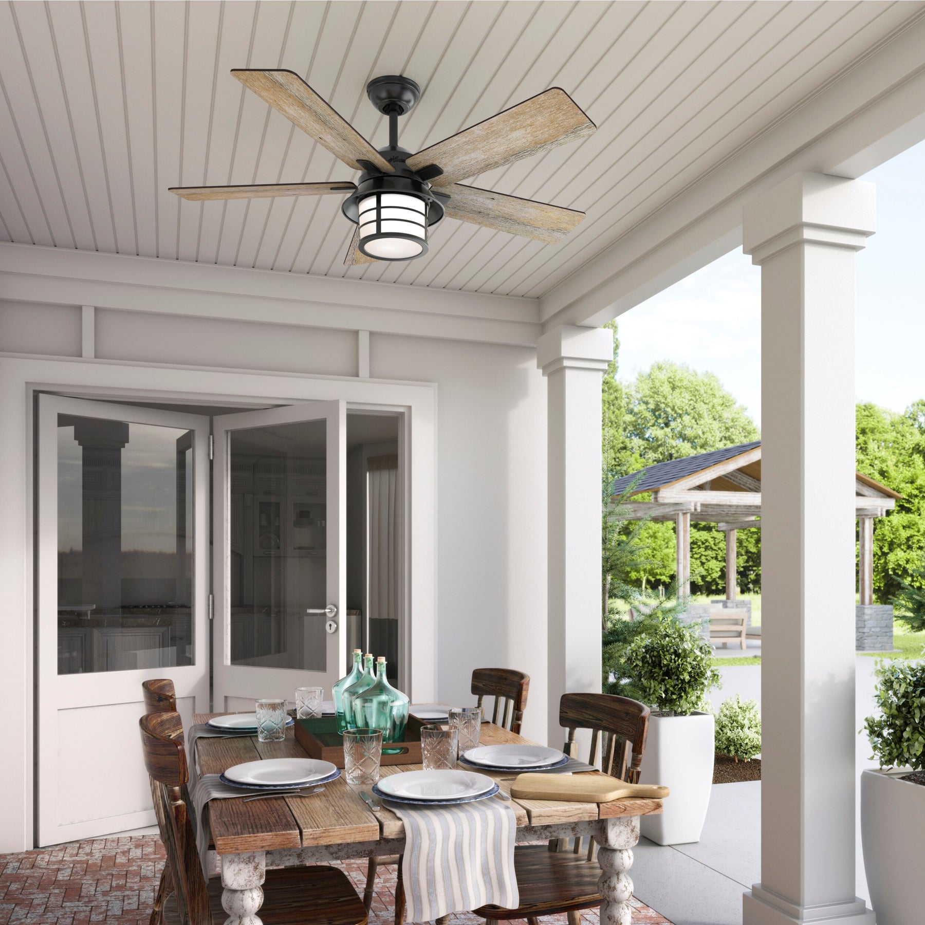 The Hunter Lantern Bay ceiling fan delivers coastal-inspired style with a matte black housing and reversible Barnwood/Medium Oak blades. Its WhisperWind AC motor provides quiet, powerful airflow, while the damp rating and integrated dimmable LED light make it ideal for covered patios, sunrooms, and large indoor spaces.