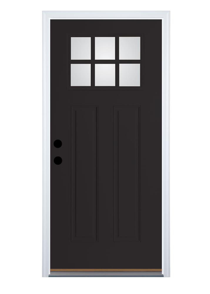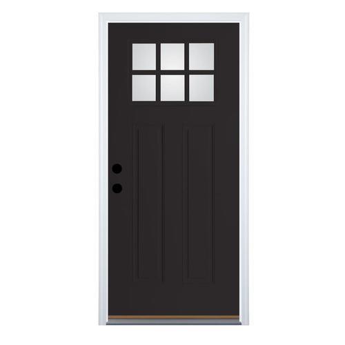 Durable fiberglass Craftsman entry door prefinished in black with simulated divided lite glass brings classic curb appeal with low maintenance. Prehung system includes frame, weatherstrip, adjustable sill and rot-resistant jambs for an efficient, ready-to-install upgrade.