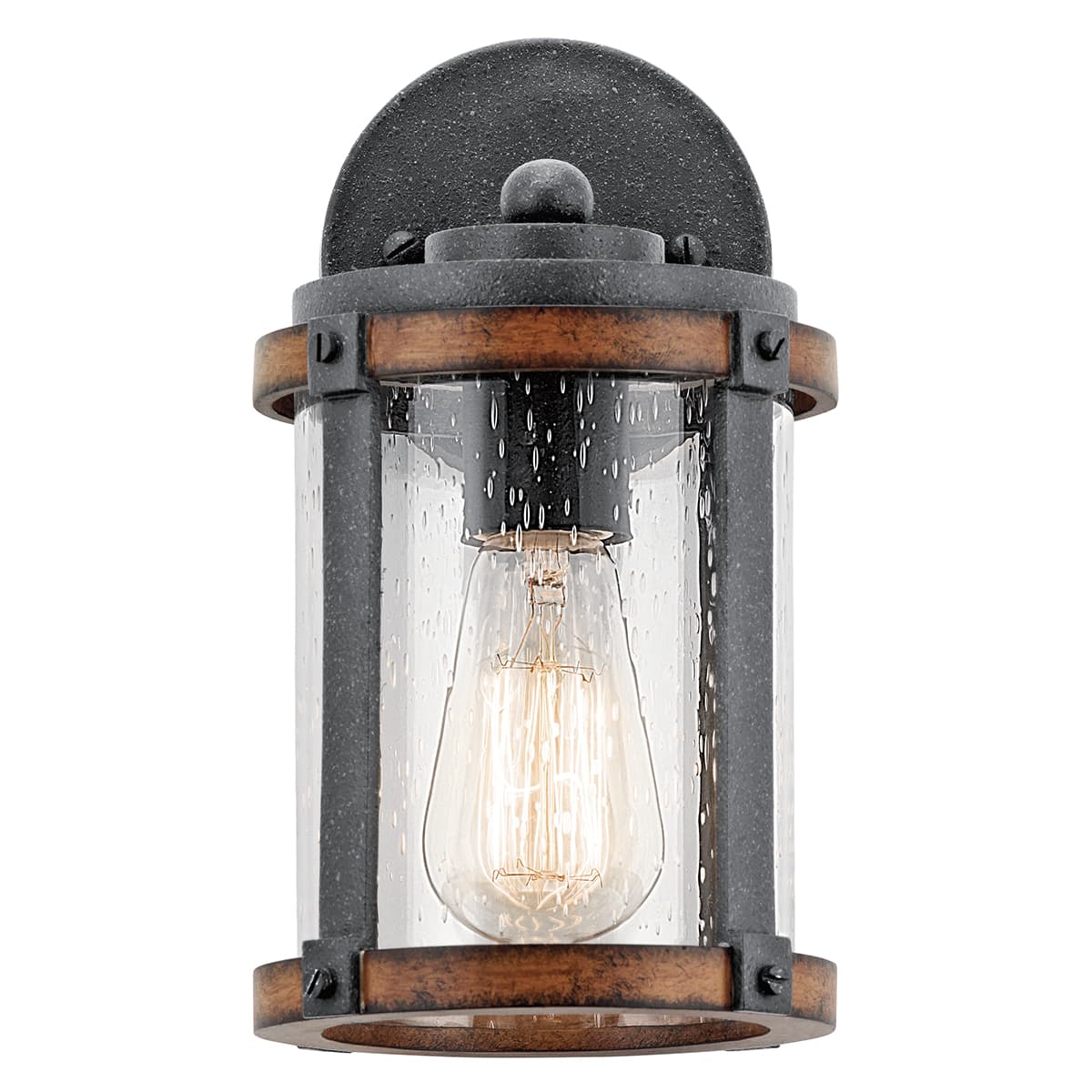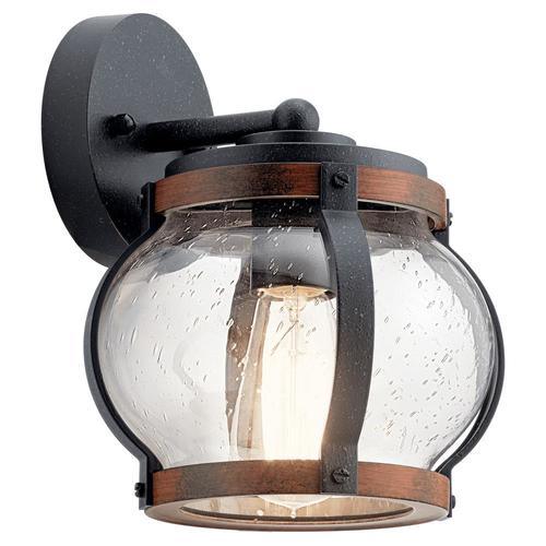 The Kichler Barrington outdoor wall light blends distressed black metal with aged-wood accents and clear seeded glass for a warm, rustic-modern look. Compact and versatile, it uses a single medium-base (E26) bulb to illuminate porches, entries, and patios with inviting character.