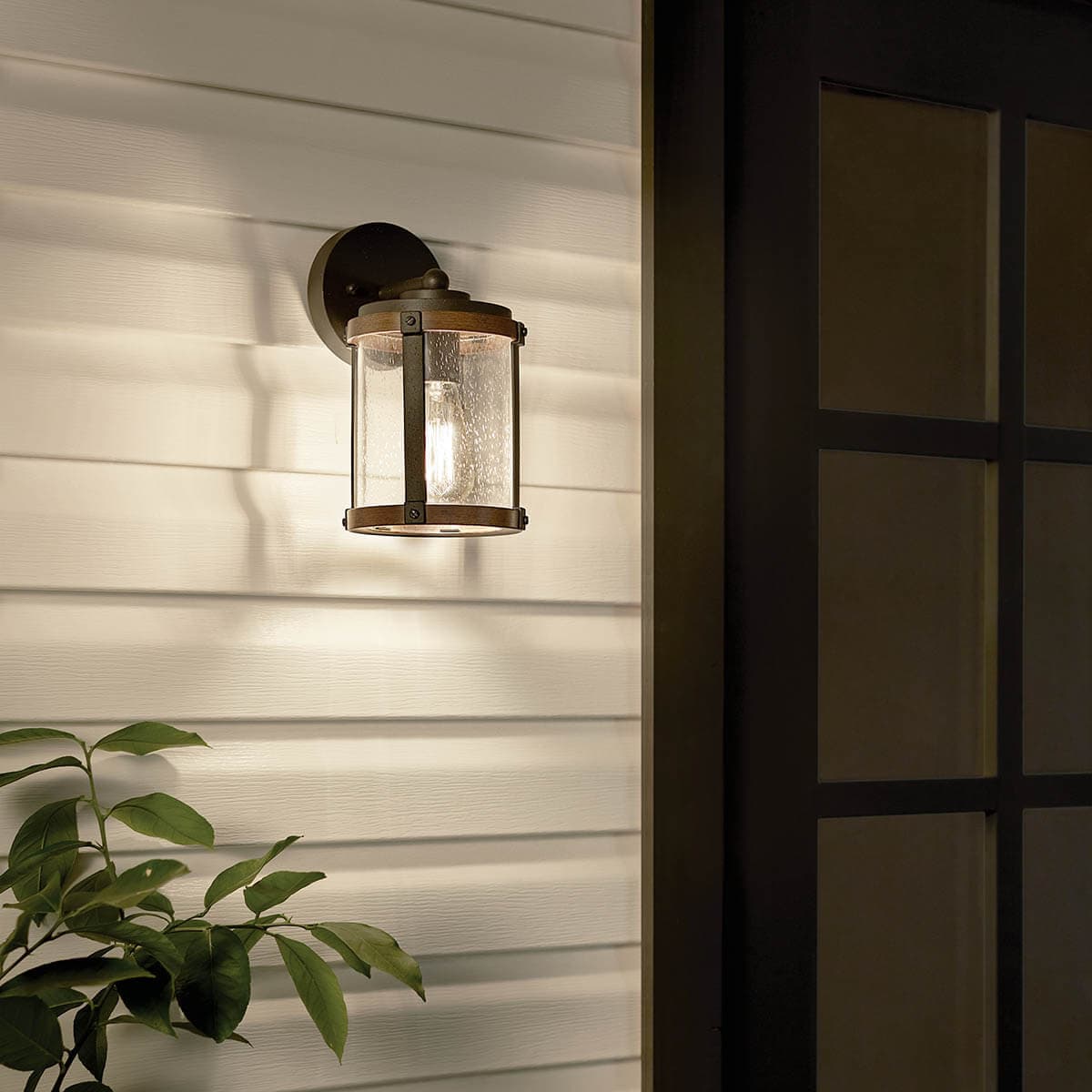 Rustic Industrial Style: Distressed black finish with aged-wood accents and clear seeded glass elevates curb appeal
