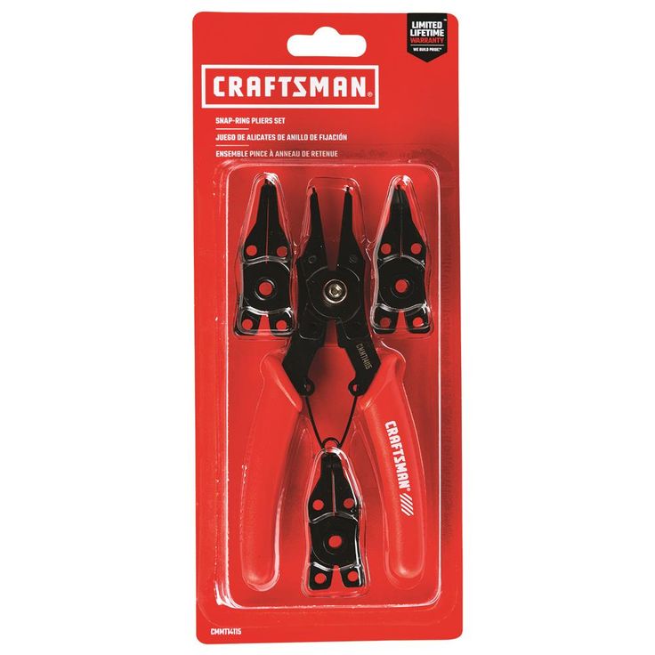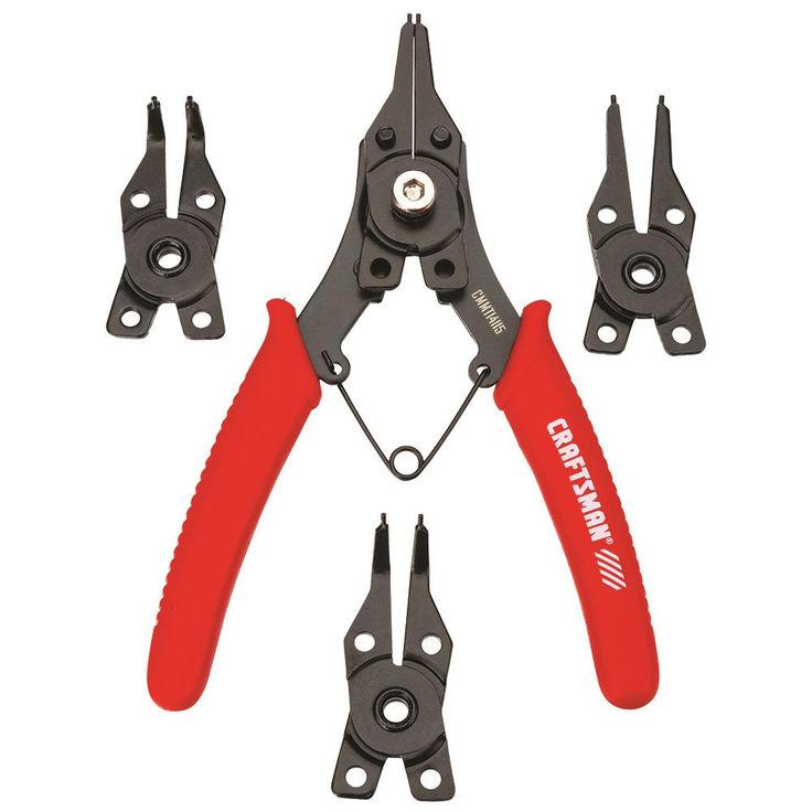 Includes (1) Snap-Ring Pliers Set with 4 interchangeable heads, including (2) straight, (1) 45 ° and (1) 90 °