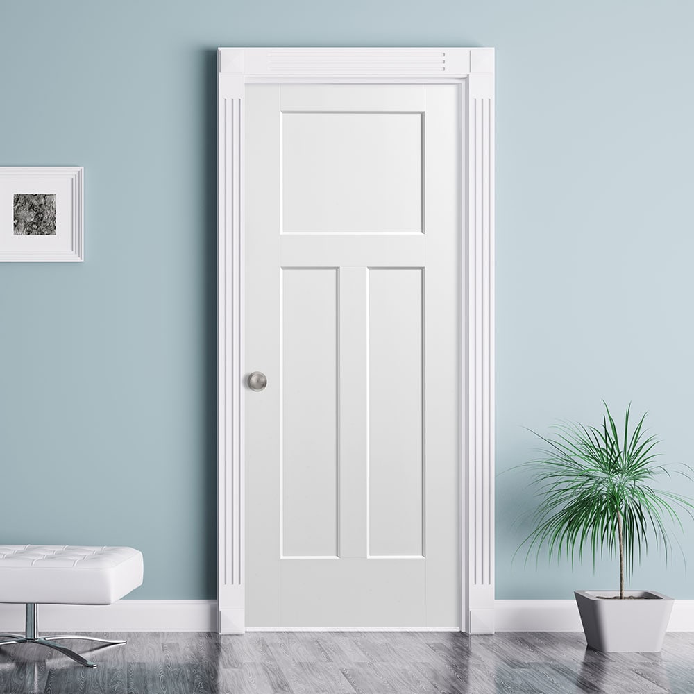 This Masonite prehung interior door pairs a classic 3-panel Craftsman look with durable molded composite construction. The primed, smooth surface arrives ready to paint, and the hollow-core design helps resist warping while keeping weight manageable for easy installation.