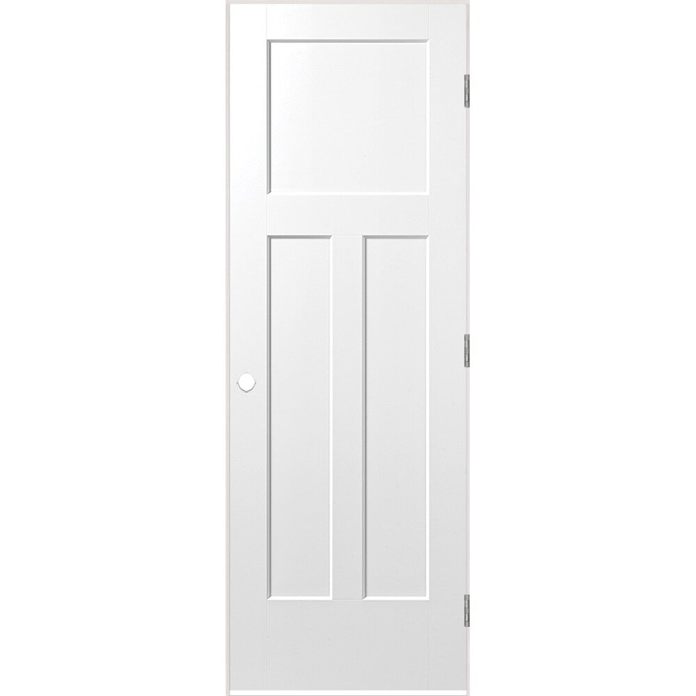 This Masonite pre-hung interior door features a solid core molded composite construction for enhanced sound blocking and a substantial feel. The smooth, primed white 3-panel Craftsman design arrives preassembled in a 4-9/16-in flat jamb, ready for easy installation and paint.