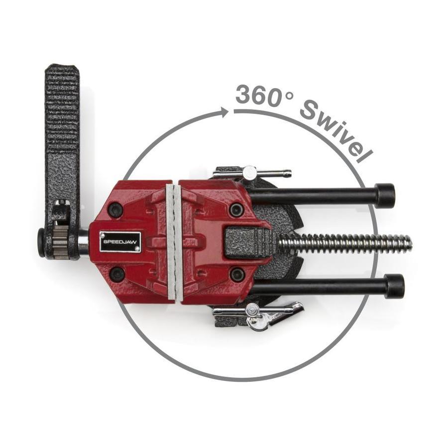 DETACHABLE BASE MOUNT - Unit clamps onto a 360-degree inscribed posi-clock disc that allows for precise rotation and lets the vise be stored out of the way when not in use