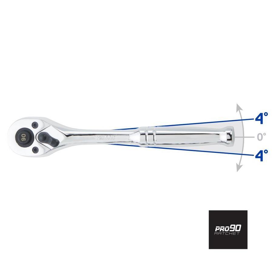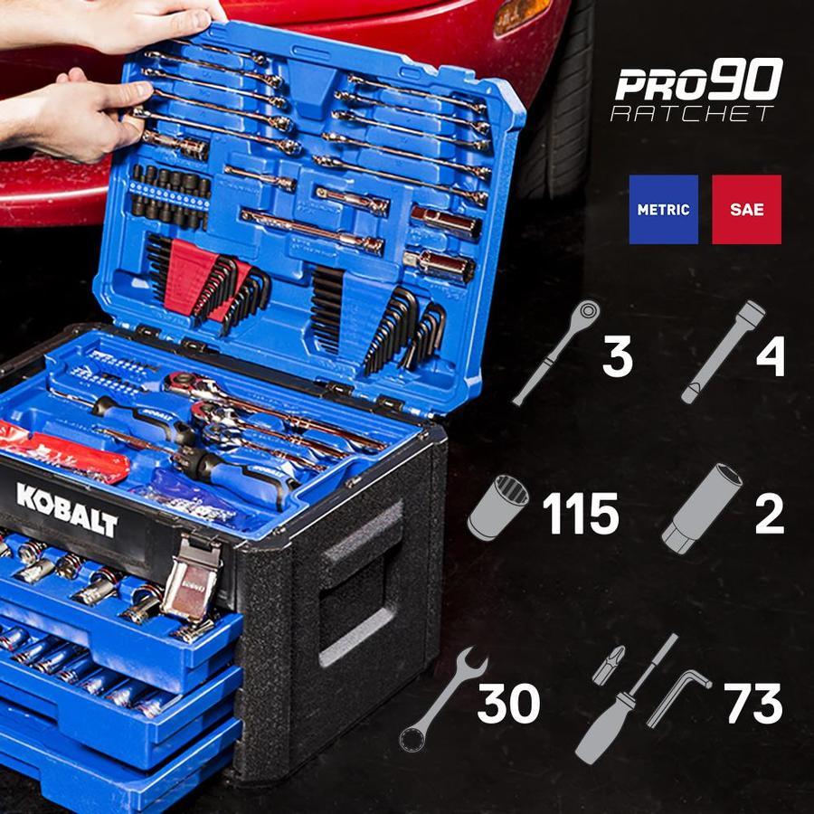 This popular 227pc mechanic's tool set includes 117 commonly used 6- and 12-point sockets, 3 PRO90 ratchets, 4 extensions, 30 wrenches that have 15 degree offset for extra clearance, 40 hex keys and 33 other tools New Improved Precise Pro90 Ratchet 90-tooth gear delivers a 4 ° precision swing that offers improved mobility in tight work spaces This set includes 1/4-in, 3/8-in and 1/2-in drive sockets, ratchets and other accessories Other tools include a magnetic bit driver, spinner handle, 12pc nut driver set and 19pc insert bit set to simplify any task Sockets, ratchets and wrenches are constructed from chrome vanadium steel and heat treated for strength and durability with a professional grade, high-polish finish Metric and SAE socket sizes are easy to identify with laser etched size call-outs and color-coded stripes to identify metric (blue) and SAE (red) measurements Updated 3-drawer blow-molded tool chest keeps your tools organized and offers convenient storage and transportation including tool storage in the lid and an empty bottom drawer Meets or exceeds ASME specifications and is protected by our hassle-free lifetime guarantee Disclaimer: 3rd drawer is purposely kept empty so you can add your favorite tools to this set - the tools in the image are for demonstration only