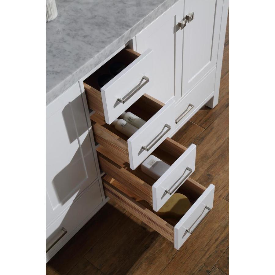 61-in W x 22-in D x 35-in H Hardwood plywood construction for lasting beauty and durability White painted finish Four soft-closing doors with adjustable hinges so you'll never have to worry about hearing a door slam Dovetail construction drawer boxes for additional strength and durability Six full extension, self-closing drawers to meet all your storage needs Satin nickel finish hardware included Open back for easier installation Carrara White marble countertop with 1.5 in. edge and matching backsplash