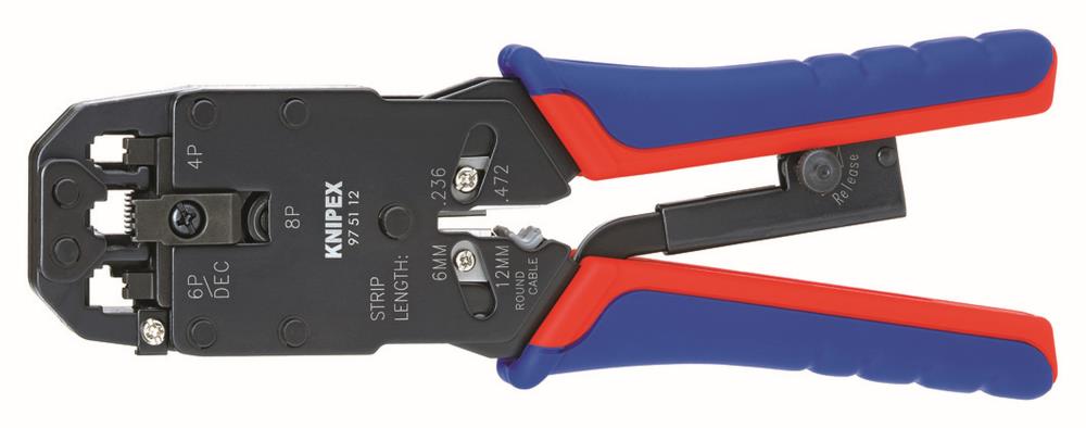 Professional crimping pliers designed for cutting, stripping, and crimping telephone and data cables. Made from chrome vanadium steel with comfort-grip handles, it handles RJ10, RJ11/12, and RJ45 western plugs and includes tools for ribbon and round cables.