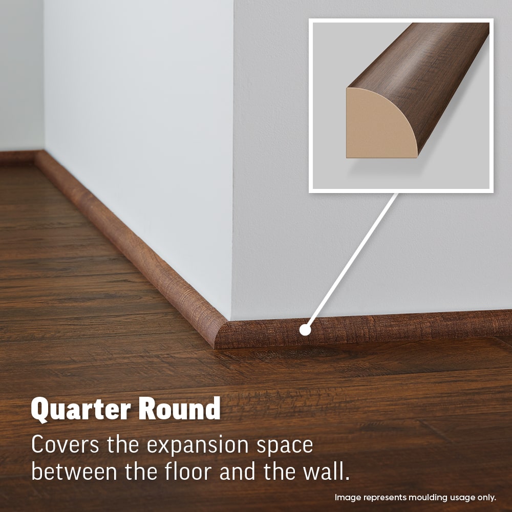 Quarter round moulding designed to neatly cover the expansion gap where floors meet walls. Made from durable MDF in a Brentwood Pine finish, sized for easy pairing with laminate or wood-look flooring.