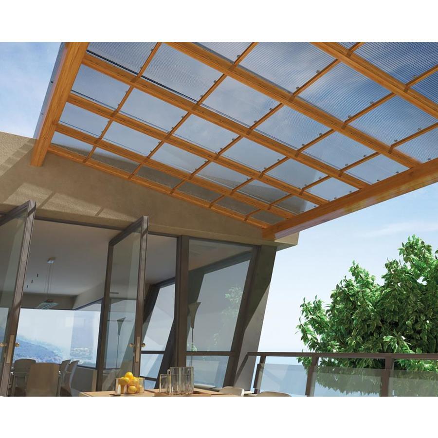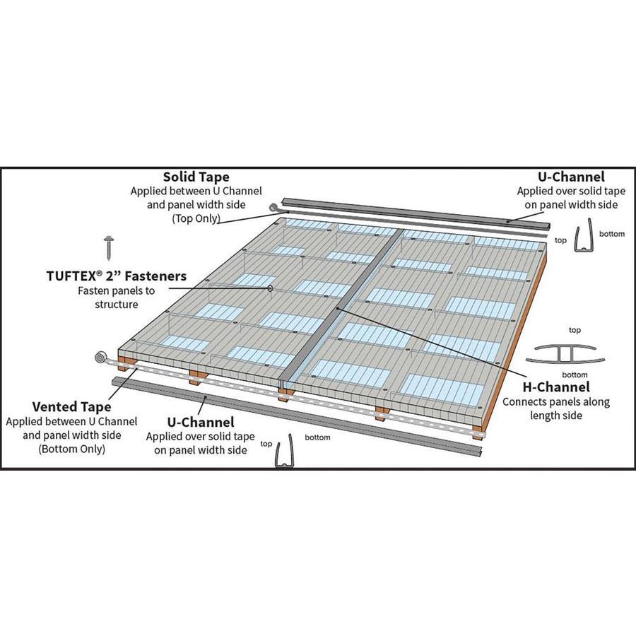 UV coated on one side Light in weight and impact-resistant Panels are great for several applications such as greenhouses, office partitions, pool enclosures, window replacements, skylights, canopies, carports, sunrooms Use TUFTEX U-channel on the top and bottom of your panel, use TUFTEX H-channel to connect two panels, use dust tape on top and bottom of the panels (refer to instructions for more details), and use TUFTEX ridge cap for the top of the panels TUFTEX Multi-Wall has a full line of accessories that includes TUFTEX ridge cap, Dust tape, 2-in screw, U-channel and H-channel are accessories that are available and sold separately Fire rating: ASTM E84 Class A Light Transmission: 80%