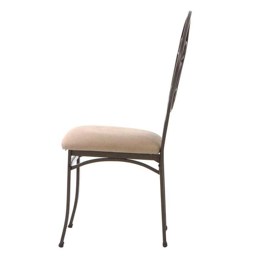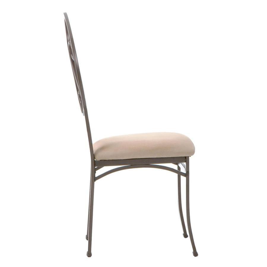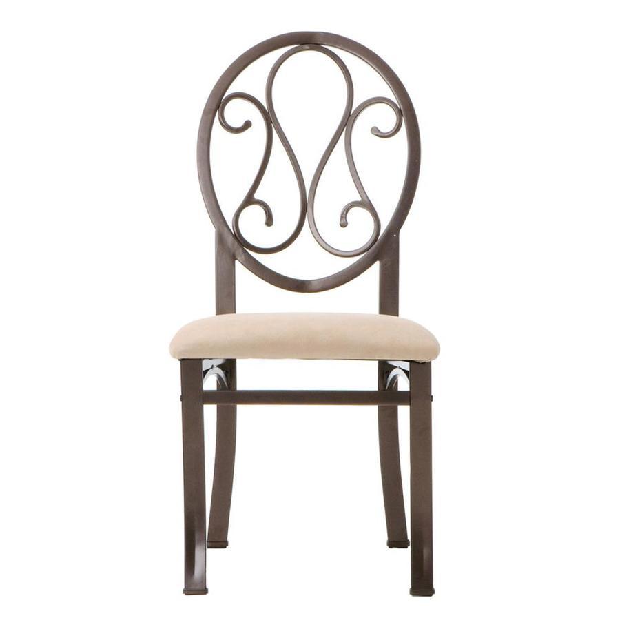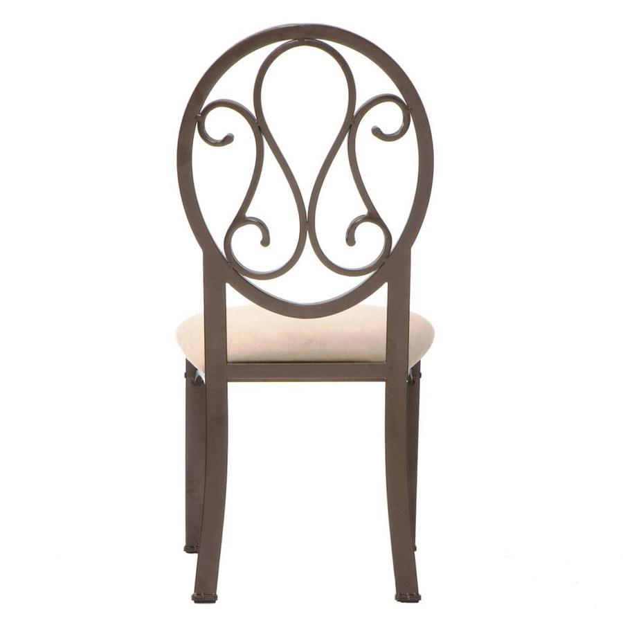 Eloquent scrolls adorn the oval back Metal tube frame is powder coated with a dark brown texture with hints of bronze highlights Over-stuffed seat cushion is covered with a beige short napped polyester fabric