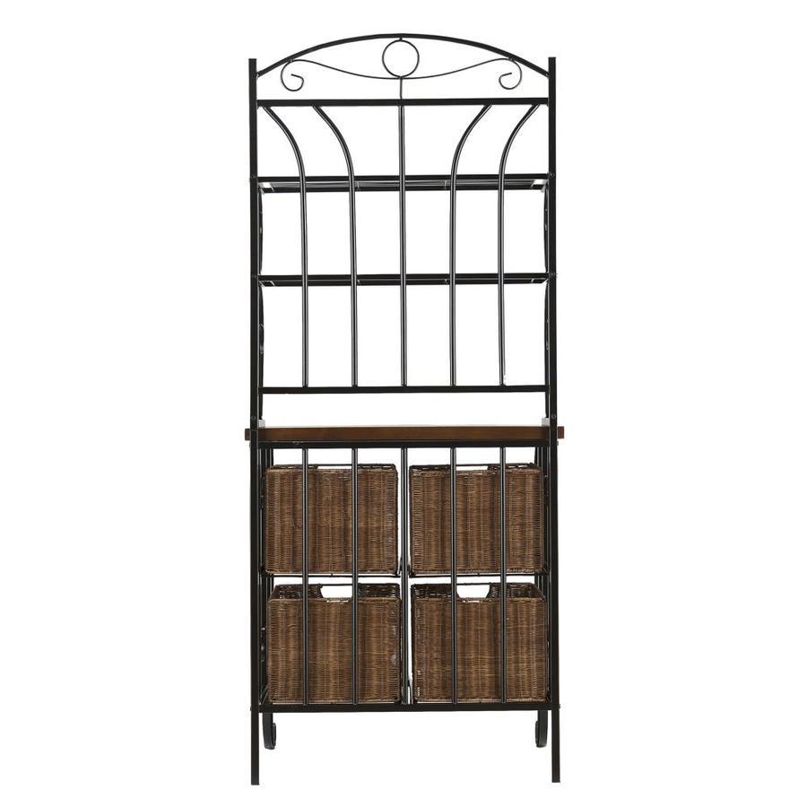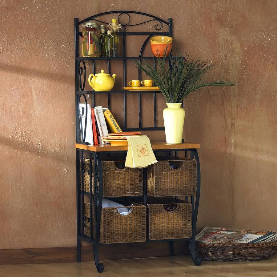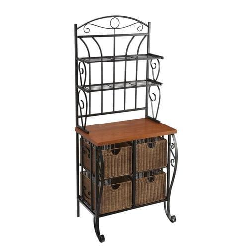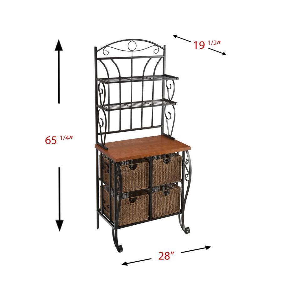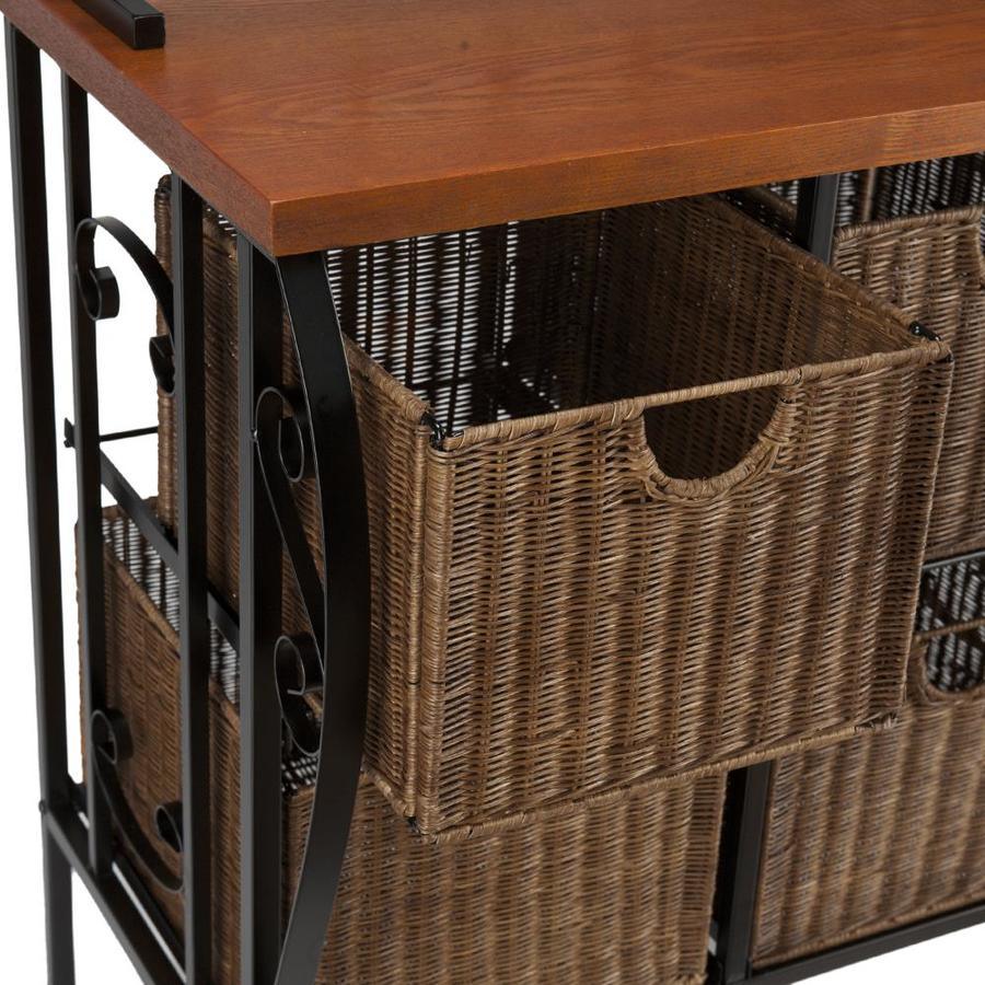 Constructed of flat metal, solid wire, wicker, and MDF The 30-in tall oak counter is 17-in deep and laminated to give a butcher block style appearance Above the countertop, the 2 deep wire shelves measure 8.5-in deep with approximately 8.5-in between them 4 brown wicker baskets (14-in L x 11-in W x 8.5-in H)