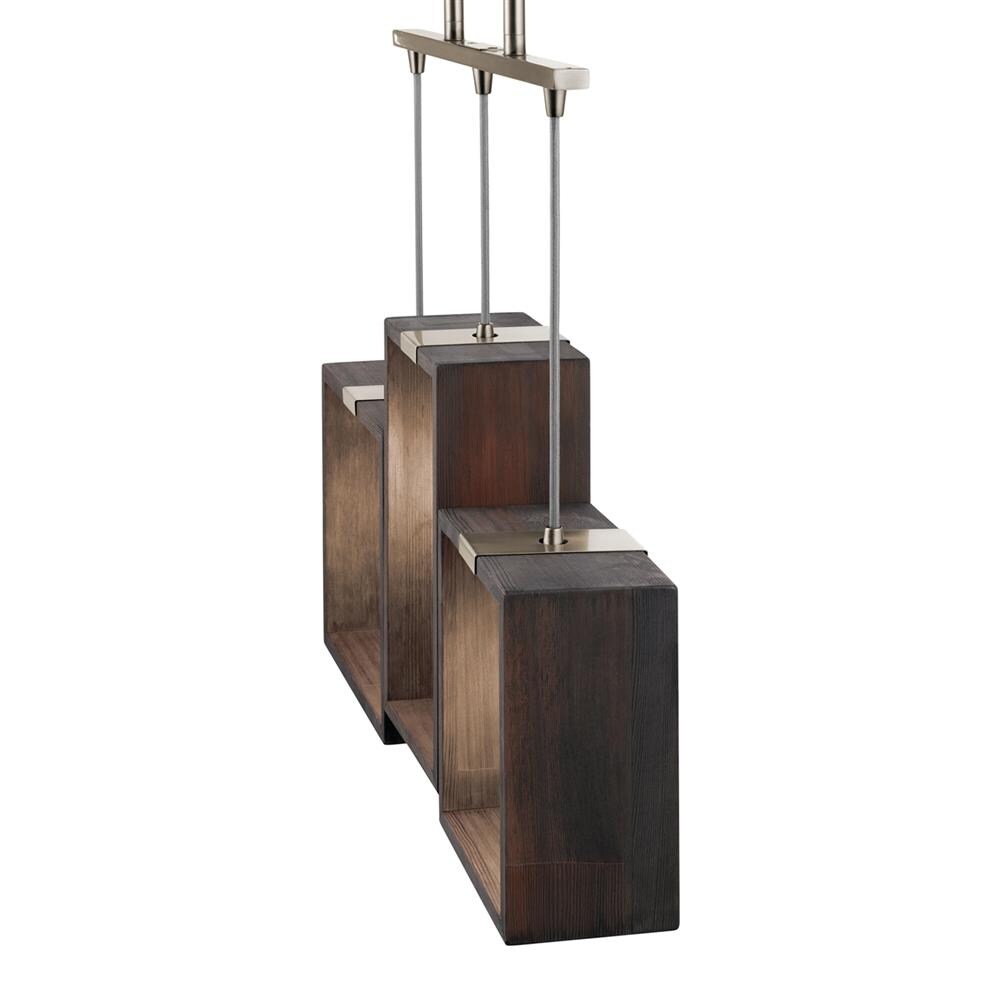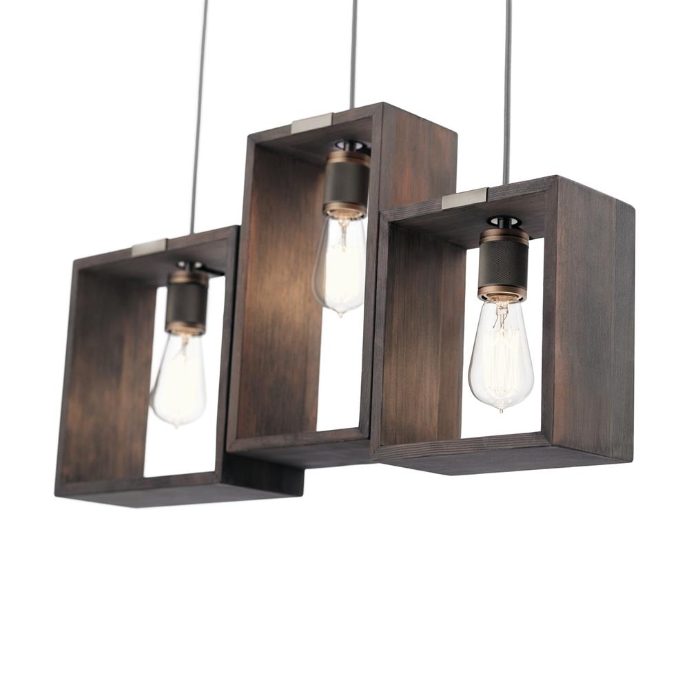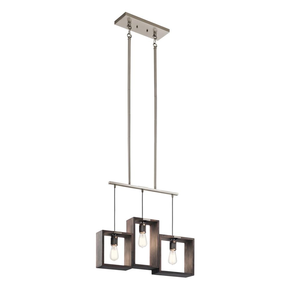 A bold industrial linear pendant from Kichler’s Industrial Frames collection, featuring three open wood frames paired with a classic pewter finish. Designed for kitchen islands or dining spaces, it’s hardwired, height-adjustable, and dimmable to set the perfect ambiance.