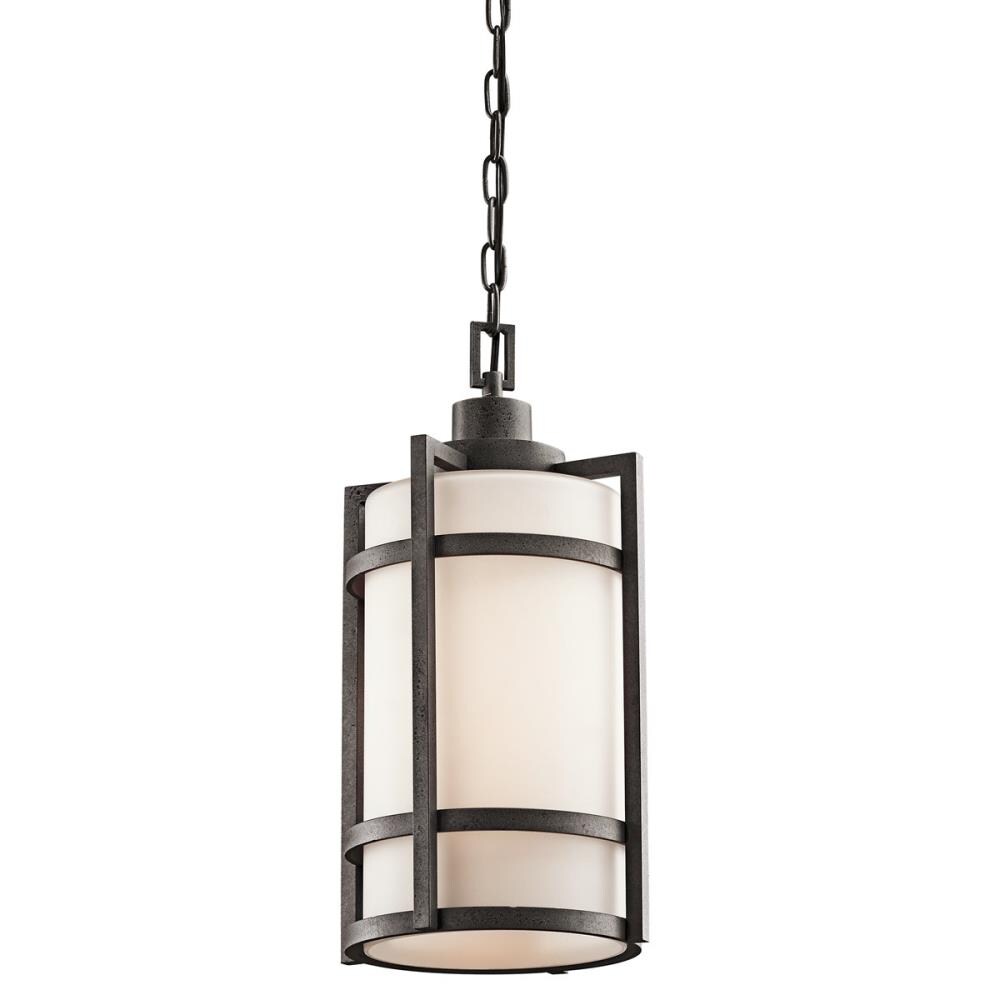 This Kichler Camden pendant features a durable cast-metal frame in Anvil Iron paired with an opal etched glass cylinder for a crisp, modern look. Adjustable hanging height and dimmable, hardwired operation make it ideal for covered outdoor living spaces or transitional indoor areas.