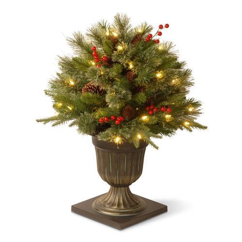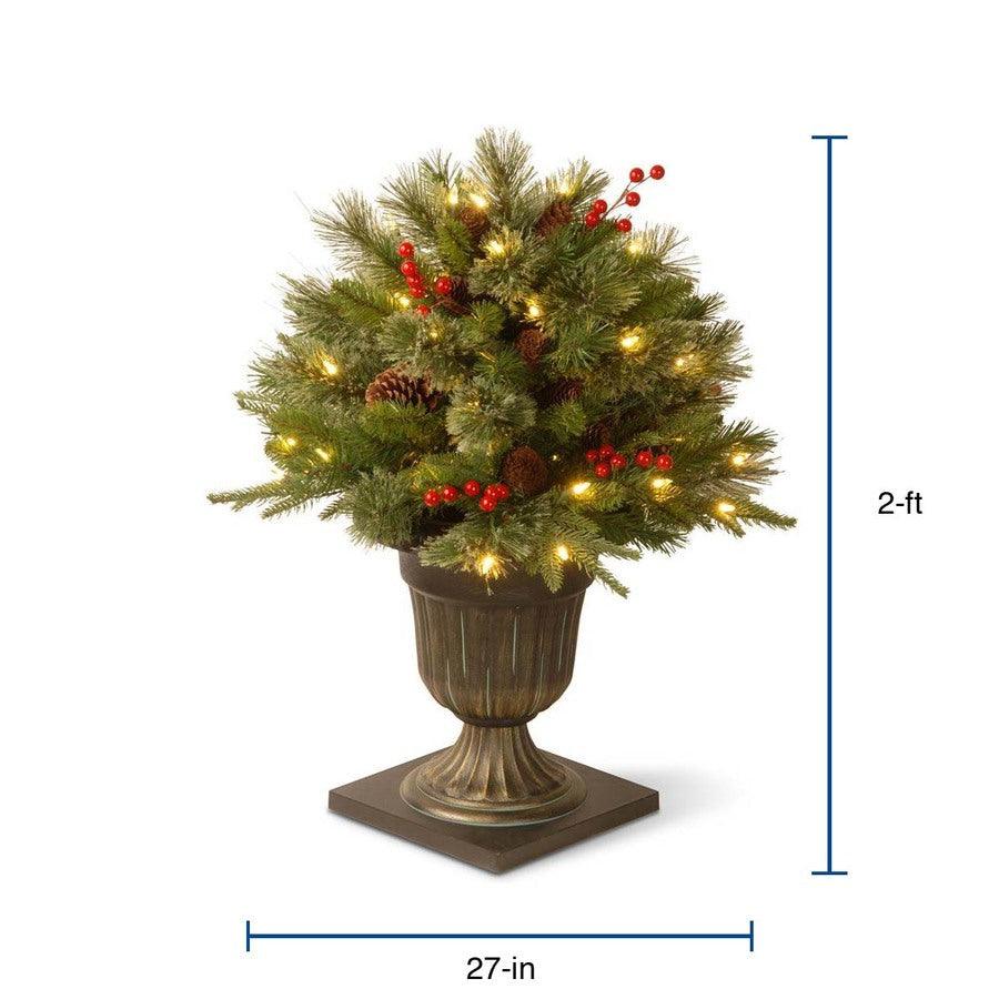 This mixed tip bush in decorative urn base is pre-strung with 50 clear lights and trimmed with red berries and pine cones